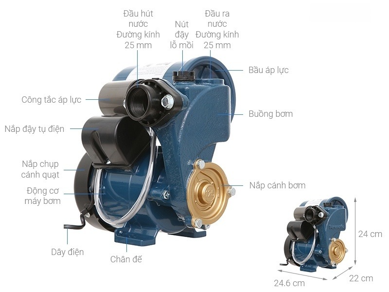 Thân máy được làm bằng nhôm đúc chắc chắn và được phủ lớp sơn tĩnh điện bên ngoài, mang lại khả năng chống ăn mòn và cách điện an toàn ngay cả khi sử dụng trong môi trường ẩm ướt. Cánh bơm được làm từ đồng, giúp tăng độ bền và khả năng chịu mài mòn tốt trong thời gian dài. Đặc biệt, lõi mô tơ của máy được quấn bằng dây đồng nguyên chất, đảm bảo khả năng vận hành ổn định, tiết kiệm điện năng và gia tăng tuổi thọ sản phẩm.