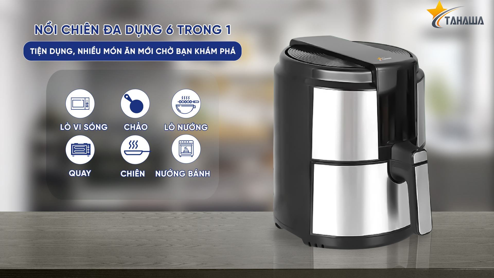Tích hợp chức năng 6 trong 1, nồi chiên không dầu Tahawa TH-221 có công suất 1500W cùng công nghệ làm nóng Rapid Air giúp chiên nướng thực phẩm chín đều, hạn chế dầu mỡ. Kết hợp với quạt đối lưu giúp món ăn được chế biến đều, nhanh chóng, giảm được tới 80% lượng dầu mỡ trong thức ăn.