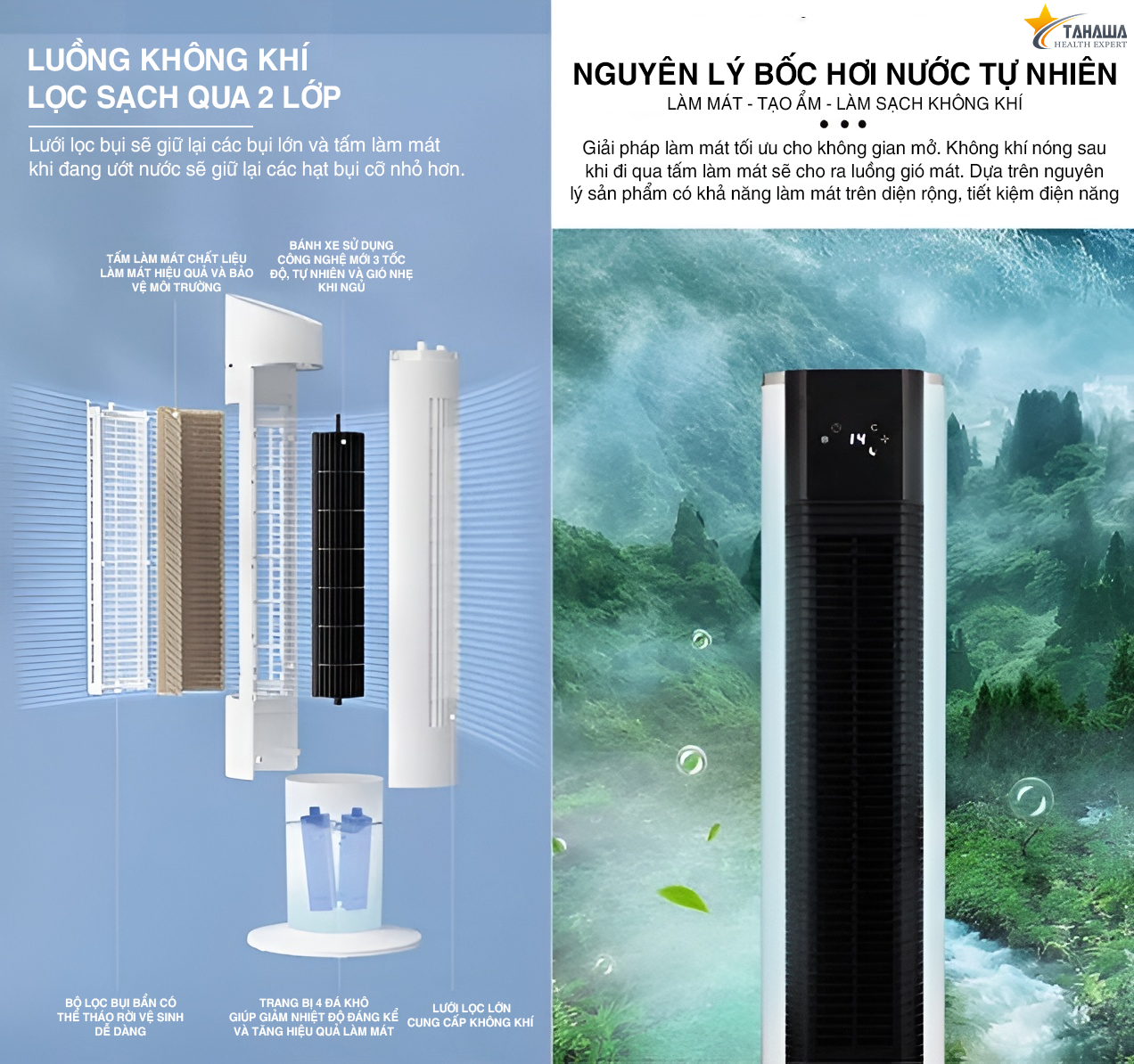 Luồng không khí được lọc sạch qua 2 lớp: lưới lọc bụi bên ngoài và tấm làm mát phía trong. Tấm làm mát chất liệu gỗ sồi ép, làm mát hiệu quả và bảo vệ môi trường. Cơ chế là lưới lọc bụi sẽ giữ lại các bụi lớn và tấm làm mát khi đang ướt nước sẽ giữ lại các hạt bụi cỡ nhỏ hơn.