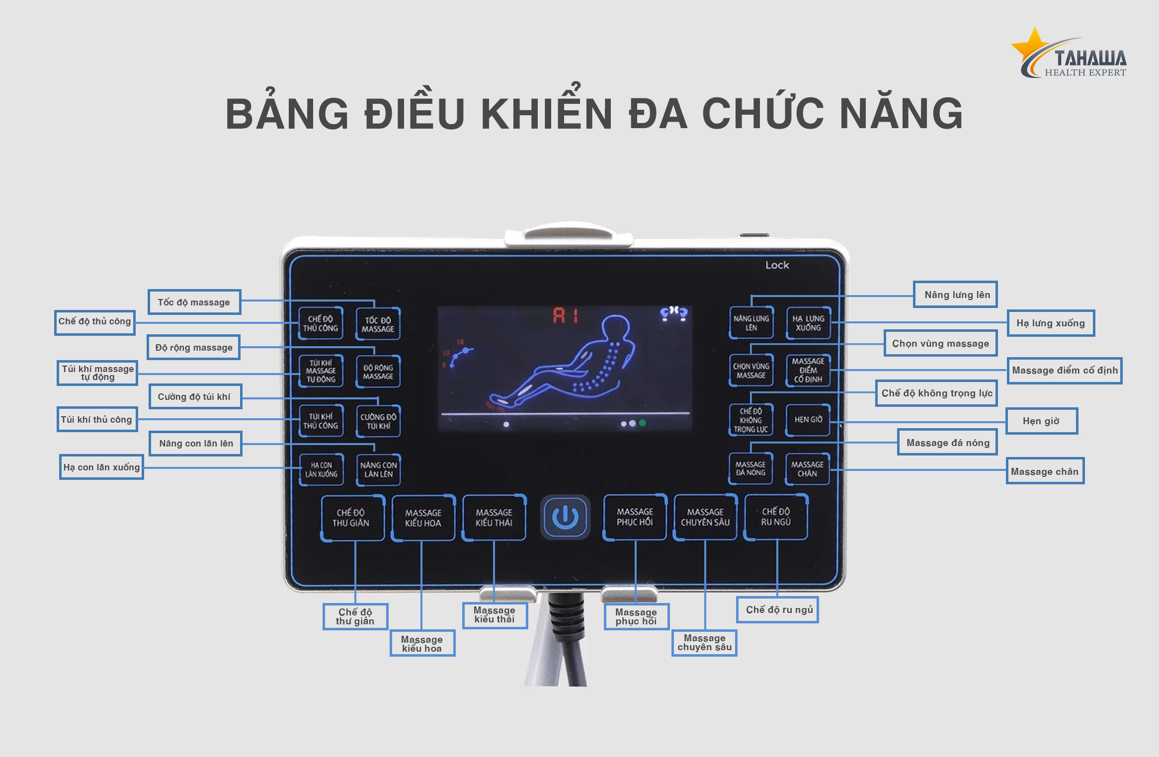 Ghế massage Tahawa TH-327 có thiết kế bảng điều khiển chi tiết kí hiệu dễ sử dụng, phù hợp cho cả người lớn tuổi. Có thể điều chỉnh thời gian, chế độ massage, tuỳ chỉ góc và thay đổi nhiều tư thế theo người sử dụng.