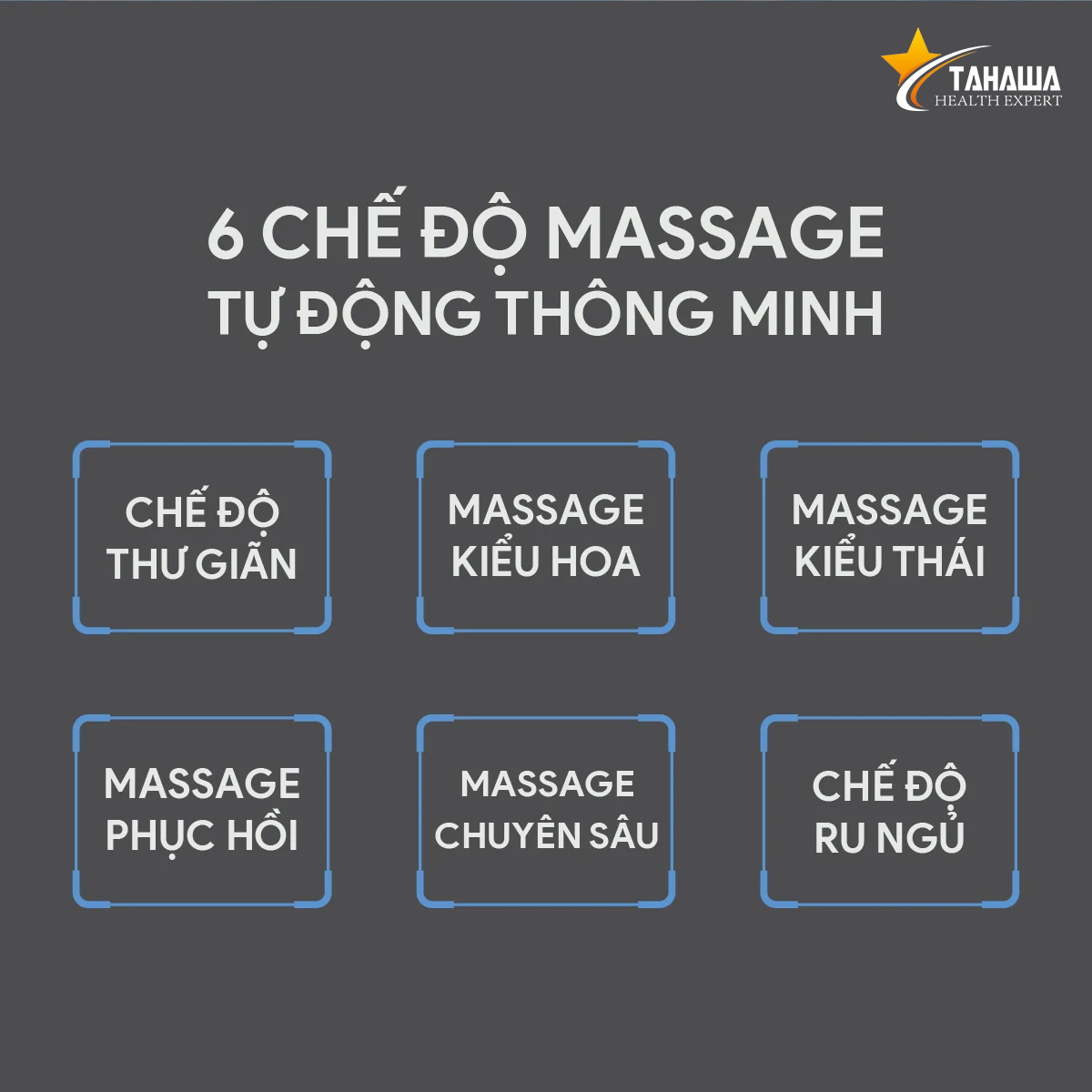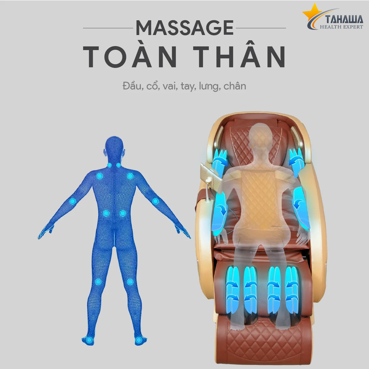 Khả năng massage tự động toàn thân với tất cả các chức năng trong khoảng thời gian 15 phút nhanh chóng phục hồi sức khỏe, thư giãn, hỗ trợ giảm nhức mỏi cơ thể. Các kỹ thuật massage được mô phỏng tự nhiên như bàn tay con người: Miết, miết vỗ, vỗ đánh, ấn đấm, ấn huyệt, bóp đẩy…