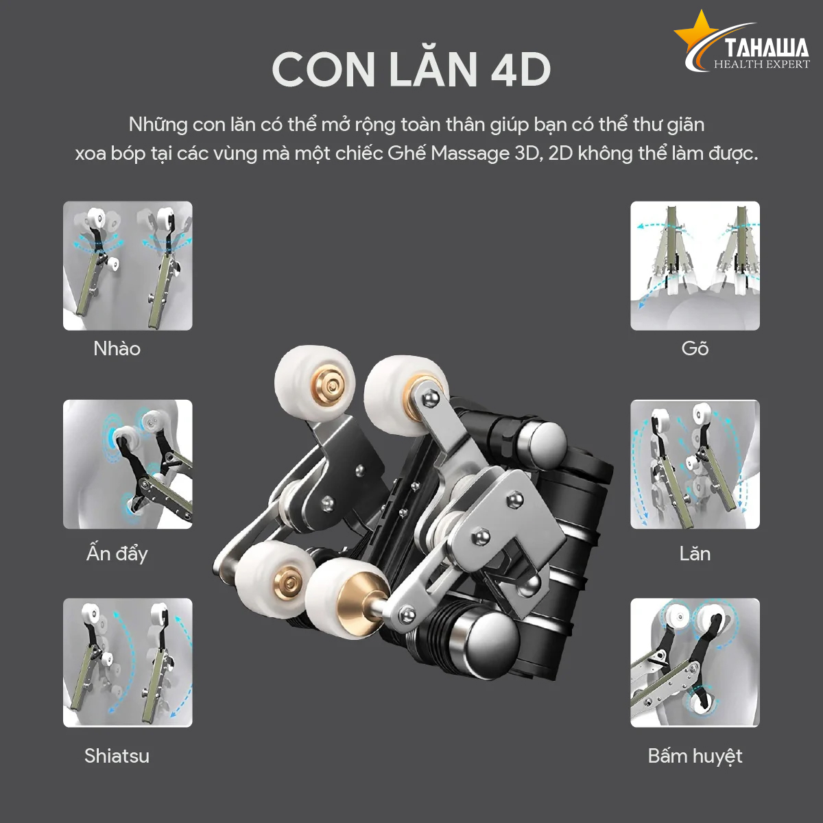 TH-327 được trang bị thế hệ con lăn massage 4D hiện đại với khả năng tự động nhận biết thể trạng người dùng. Hệ thống 8 con lăn chuyển động quay di chuyển theo các hướng: trên/ dưới, trái/ phải, trong/ ngoài, phía trước/ phía trên giúp con lăn có thể chạm tới các vùng mà ghế massage khác không thể tác động tới như: phần phía trên của bắp đùi, phần thắt lưng… Trải nghiệm một chiếc ghế massage 4D sẽ giúp bạn có những giây phút thư giãn trên cả tuyệt vời.