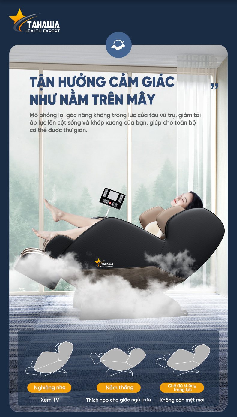 Chế độ không trọng lực còn được gọi là Zero Gravity là một trong những điểm nổi trội của ghế massage TH-XR28. Chế độ này sẽ đưa người dùng đến một góc độ đã được định sẵn. Ở đó cột sống của bạn sẽ được giảm áp lực một cách hiệu quả nhất. Chế độ này cực kỳ thích hợp đối với những người thường xuyên phải làm việc năng, hoạt động thể dục thể thao trong thời gian dài, dân văn phòng phải ngồi nhiều hay những người thường xuyên bị nhức mỏi vùng lưng. Một lời khuyên dành cho bạn là hãy sử dụng chế độ này kết hợp với massage roàn thân để để cơ xương được thư giãn và phục hồi tốt nhất., như vậy hiệu quả massage sẽ đạt hiệu quả tối đa.