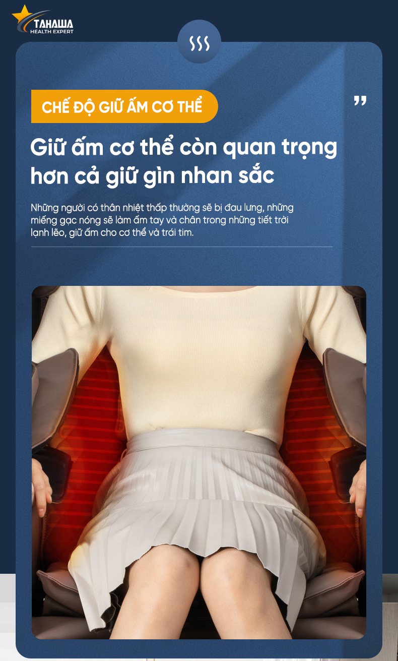 Chế dộ hồng ngoại và giữ ấm cơ thể là một trong những tính năng tuyệt vời có trên ghế massage Tahawa TH-XR28. hệ thống đèn hồng ngoại có trên ghế massage giúp hệ thống tuần hoàn máu của của thể hoạt động hiệu quả hơn, qua đó giúp thư giãn cơ thể tốt hơn. Việc massage kết hợp với chế độ nhiệt làm nóng một cách thích hợp có thể giúp quá trình giảm đau nhức được hoạt động hiệu quả.