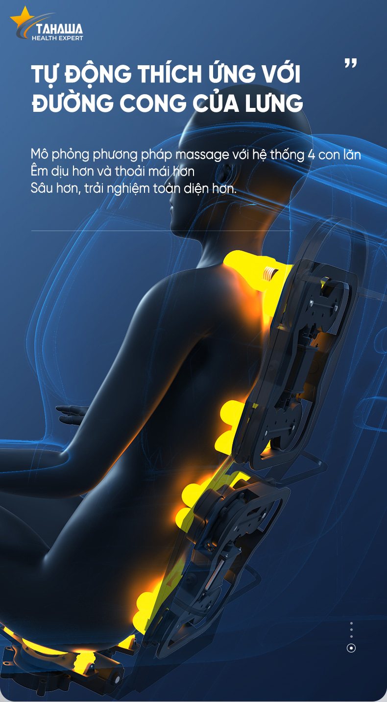 Trên ghế massage Tahawa TH-XR28 sở hữu hệ thống khung sườn ôm sát cơ thể kết hợp với bộ con lăn thông minh luân phiên massage, tự động thích ứng với đường cong của lưng, mô phỏng phương pháp massage lưng thủ công. Điều này sẽ giúp vùng lưng của bạn được chăm sóc hiệu quả hơn, giảm nhanh các triệu chứng đau lưng, hông. Chắc chắn, với chiếc ghế massage Tahawa TH-XR28 bạn và gia đình sẽ được massage sâu, trải nghiệm toàn diện hơn.
