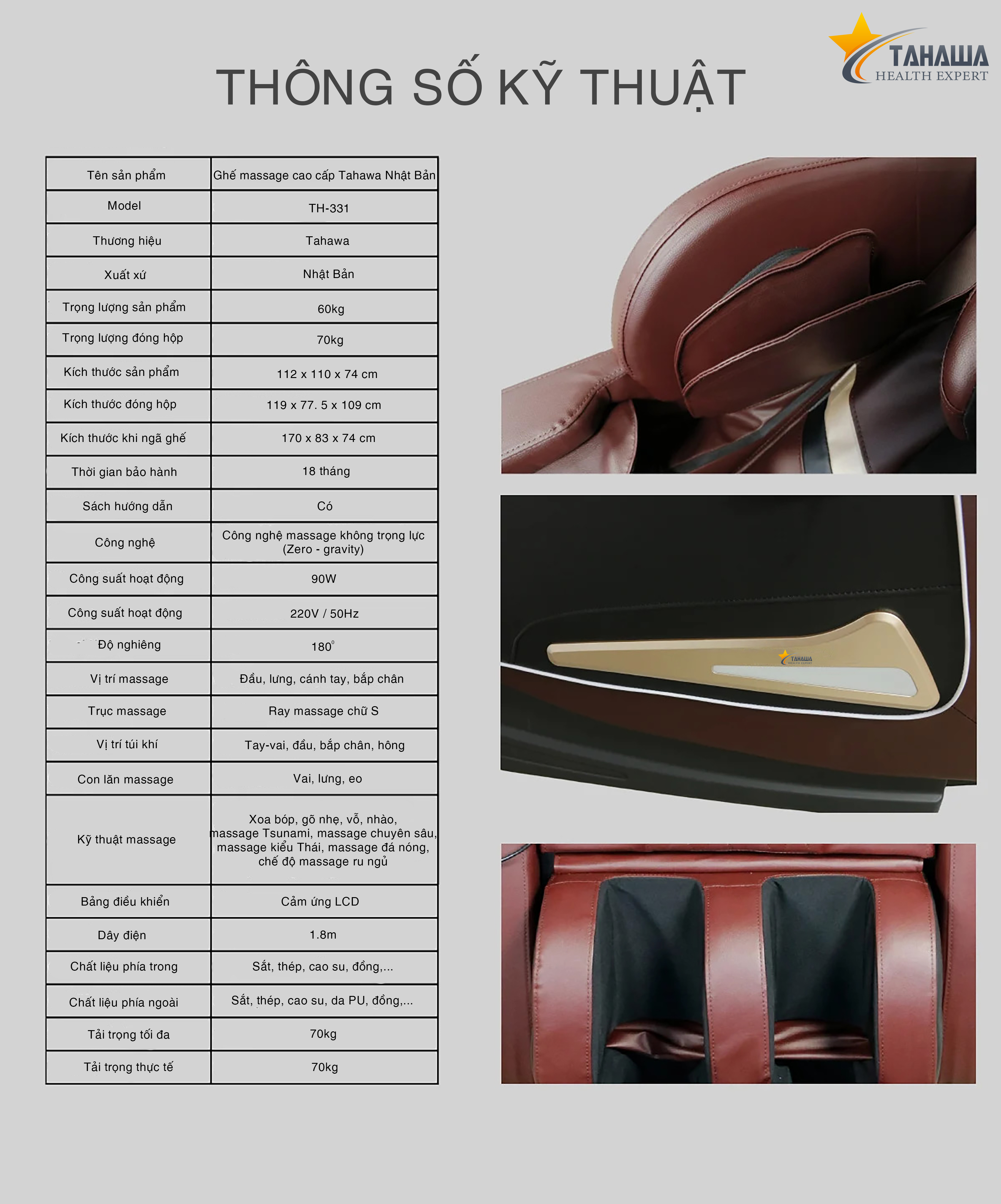Trải nghiệm Massage cực đã ngay tại nhà – ghế massage với ghế massage Tahawa TH-331. Bạn đang gặp các vấn đề về đau nhức cơ thể, căng thẳng, stress, cơ thể trì trệ vì mất ngủ, trí nhớ giảm sút. Ghế massage Tahawa TH-331 sẽ giúp nâng cao chất lượng cuộc sống của bạn nhờ những lợi ích sức khỏe mà sản phẩm này mang lại. Con lăn 4D massage chuyên sâu vào các vùng đau nhức, tổn thương trên cơ thể như lưng, bả vai, thắt lưng, khớp gối,… Với những cải tiến, bổ sung về chức năng mới nhất, ghế massage Tahawa TH-331 hứa hẹn sẽ là một dòng ghế vượt trội trong tầm giá.