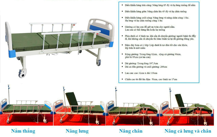 Giường có thiết kế lan can cao với kích thước 32cm x 119cm (Cao x Dài) đảm bảo an toàn cho người bệnh khi năm hoặc di chuyển. Lan can có thể dựng lên hoặc hạ xuống.
