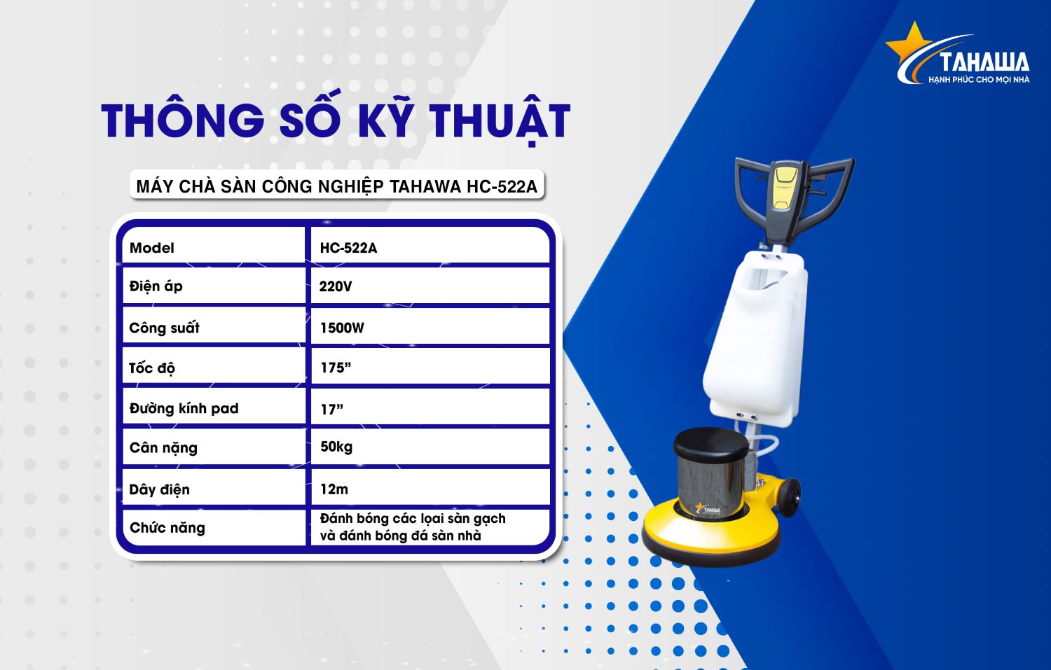 Máy chà sàn Tahawa HC-522A có đầy đủ các tính năng cần thiết để làm sạch các loại sàn bẩn và đánh bóng các loại sàn như đá và gạch. Máy sử dụng một pad chà có đường kính lên đến 17 inch để đảm bảo việc làm sạch hiệu quả trên diện tích lớn. Với công suất 1500W và tốc độ 175”, máy có thể loại bỏ các vết bẩn, bụi bẩn và dấu vết trên bề mặt sàn nhanh chóng và hiệu quả.