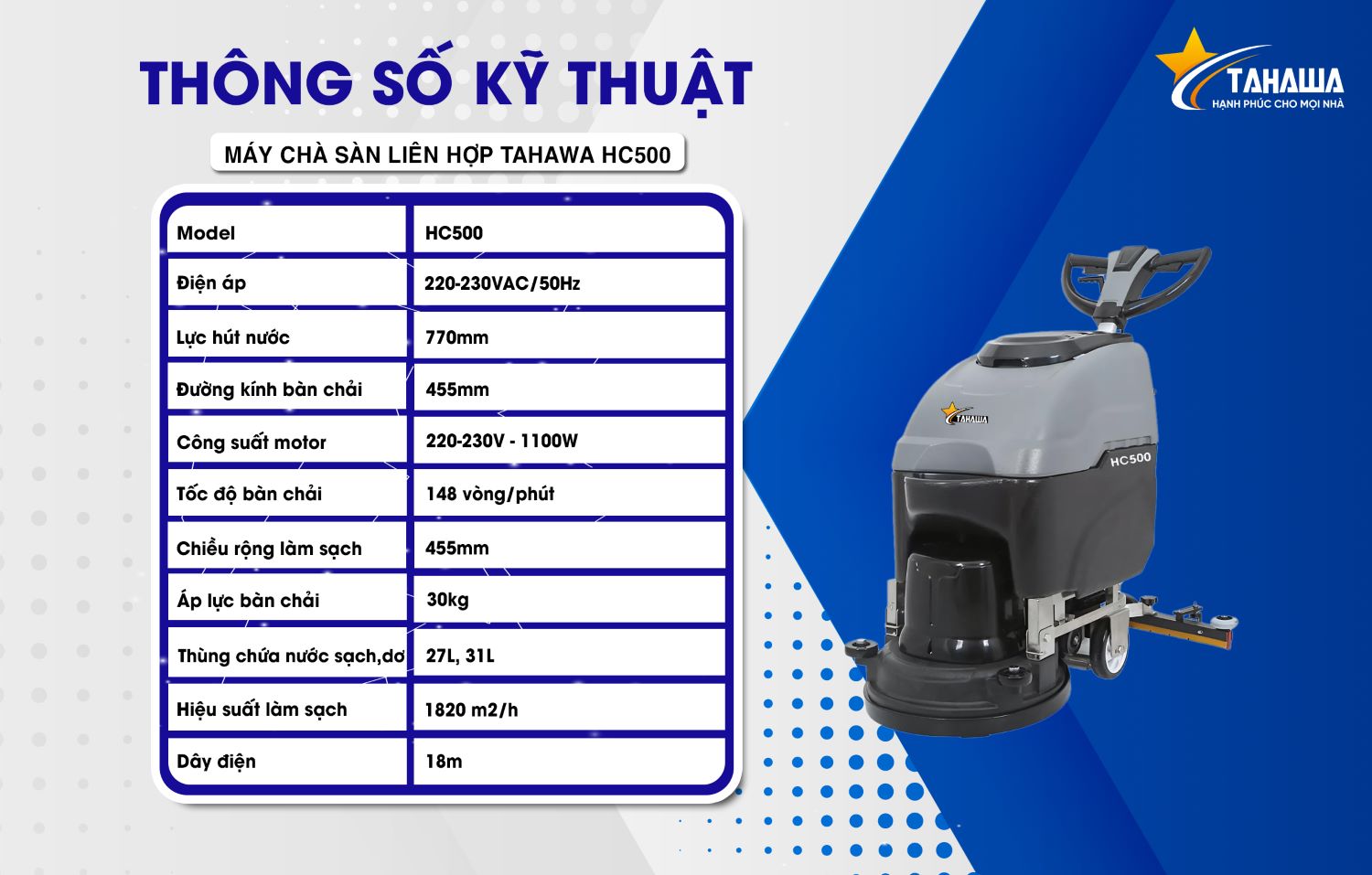 - 2. Thông số kỹ thuật của máy chà sàn Tahawa HC 500