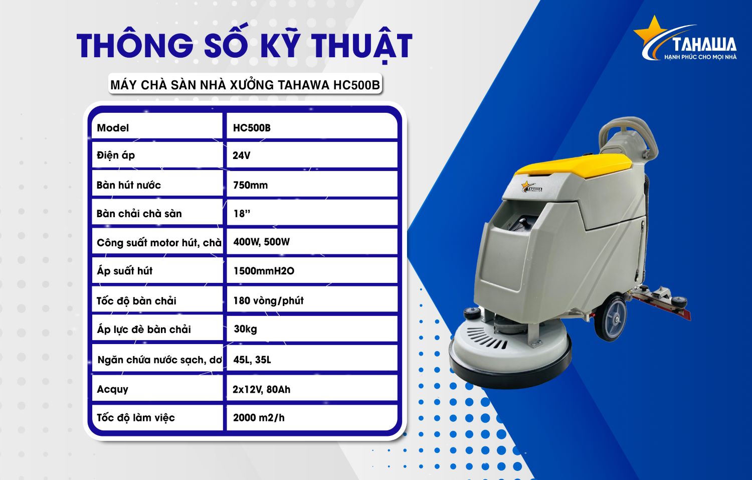1. Thông số kỹ thuật nổi bật của máy chà sàn nhà xưởng Tahawa HC500B
