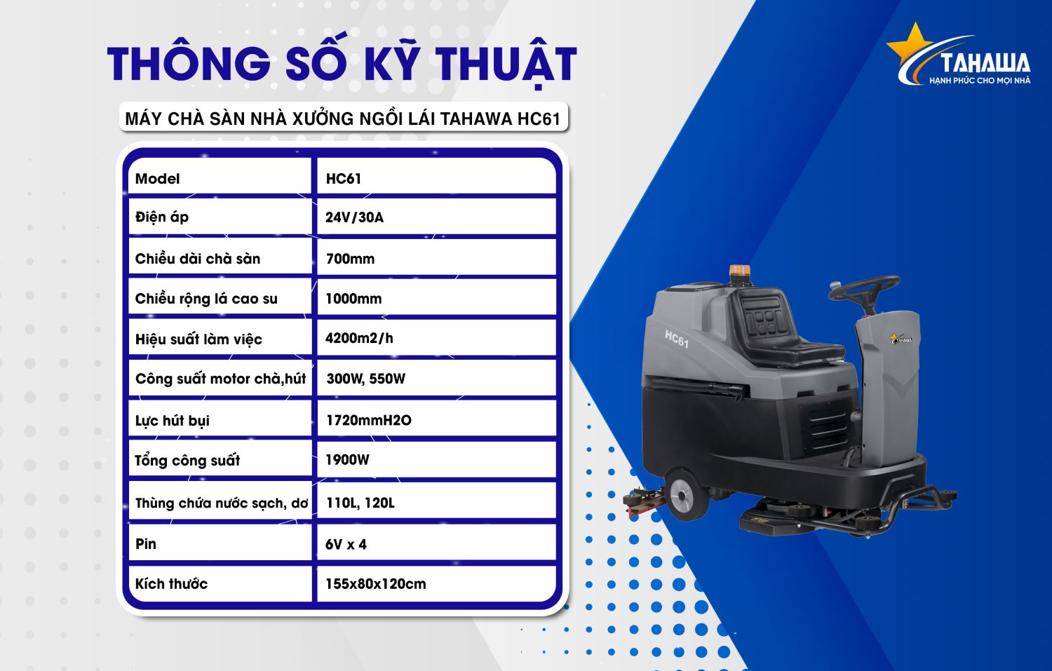 Máy chà sàn ngồi lái của Nhật Tahawa HC61 là một trong những dòng máy chà sàn công nghiệp hiện đại, đáp ứng nhu cầu vệ sinh sàn nhà xưởng, kho bãi, siêu thị, trung tâm thương mại, bệnh viện, sân bay và nhiều không gian rộng lớn khác. Với thiết kế mạnh mẽ, hiệu suất làm việc cao và khả năng vận hành linh hoạt, đây là sản phẩm lý tưởng để giúp doanh nghiệp tiết kiệm thời gian và chi phí vệ sinh.
