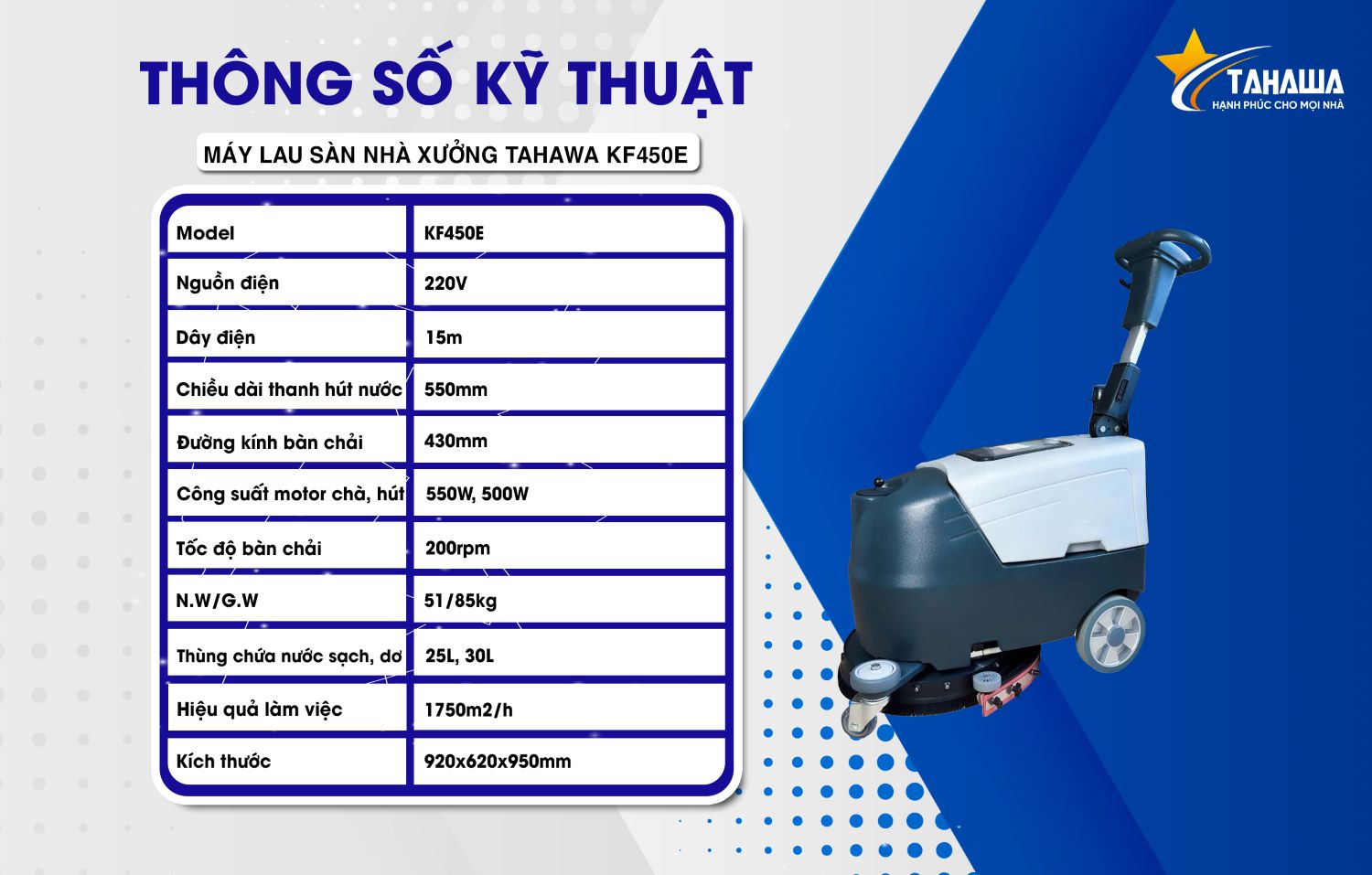 - 2. Thông số kỹ thuật của máy lau sàn nhà xưởng Tahawa Nhật Bản KF450E