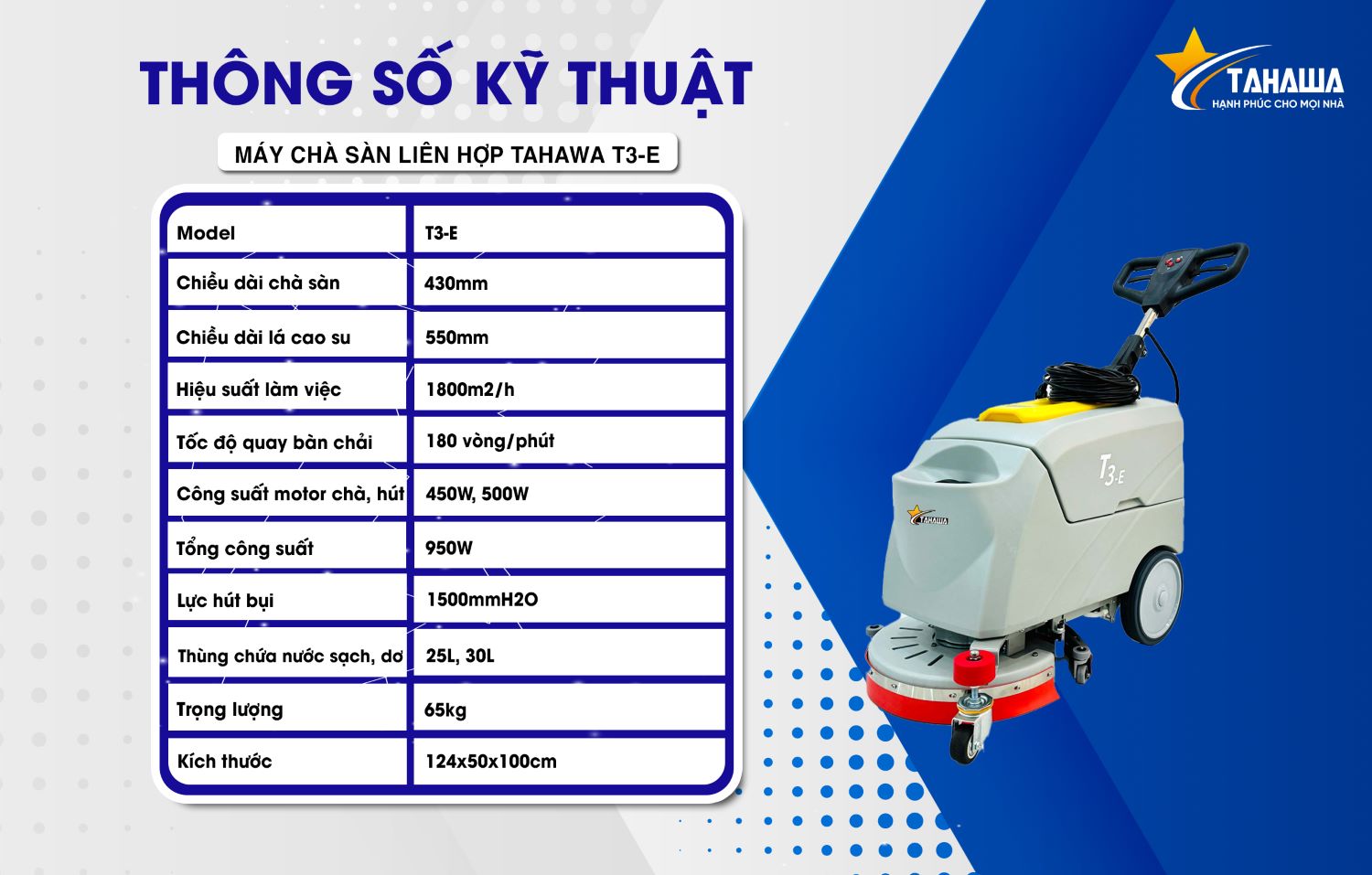 Máy chà sàn liên hợp Tahawa T3-E là dòng thiết bị vệ sinh công nghiệp cao cấp đến từ thương hiệu Tahawa Nhật Bản, được thiết kế chuyên dụng để làm sạch các bề mặt sàn tại các khu vực có diện tích lớn như nhà xưởng, kho bãi, siêu thị, trung tâm thương mại, bệnh viện và trường học. Với khả năng vận hành mạnh mẽ, động cơ bền bỉ và hiệu suất làm việc cao, Tahawa T3-E chính là giải pháp lý tưởng giúp tiết kiệm thời gian, chi phí và công sức trong việc vệ sinh sàn nhà.