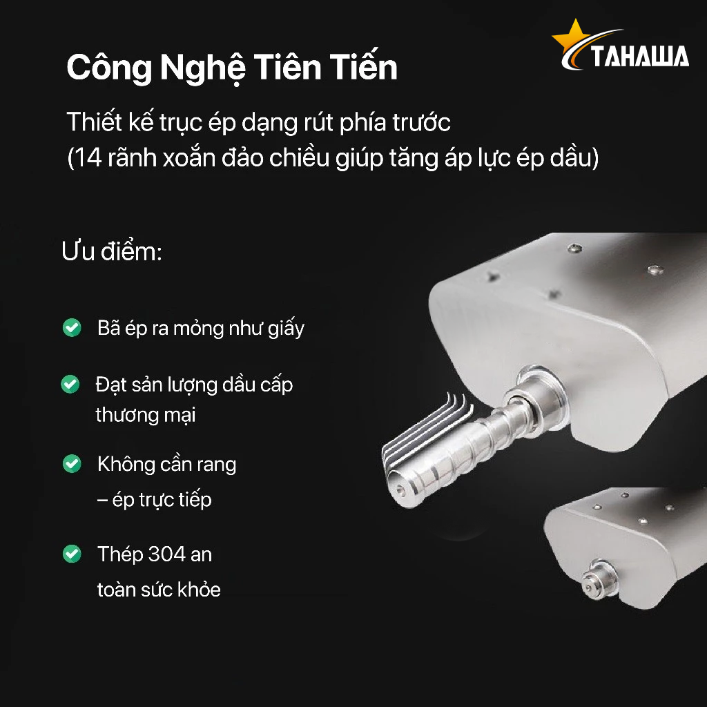Dễ Dàng Tháo Lắp: Trục ép thiết kế dạng cài, dễ dàng tháo lắp nhanh chóng. Trục ép bằng Inox 316 dạng xoắn tháp, giúp ép nhanh hơn và kiệt dầu hơn.