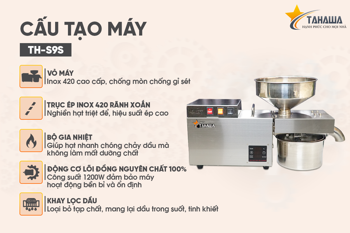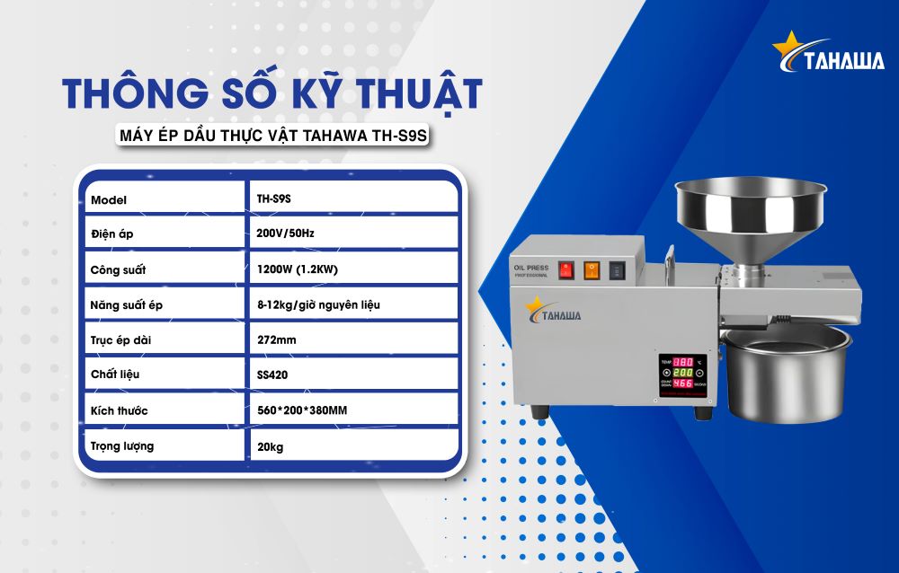 Tahawa TH-S9S được thiết kế với thanh ép dài hơn, buồng ép lớn hơn cùng với phễu chứa nguyên liệu 5 lít và ca hứng dầu 4 lít, đáp ứng tốt cho nhu cầu ép 8–12kg nguyên liệu mỗi giờ.