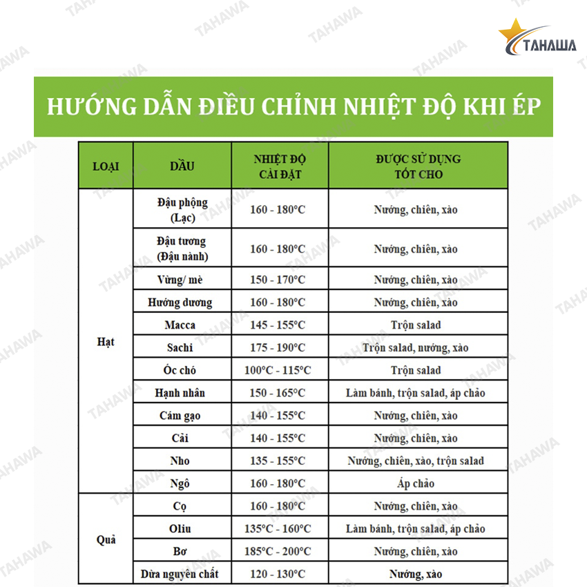 => Lưu ý: Thông số cài nhiệt độ trên sẽ là tương đối, còn tuỳ thuộc vào môi trường độ ẩm thực phẩm thực tế khi ép.