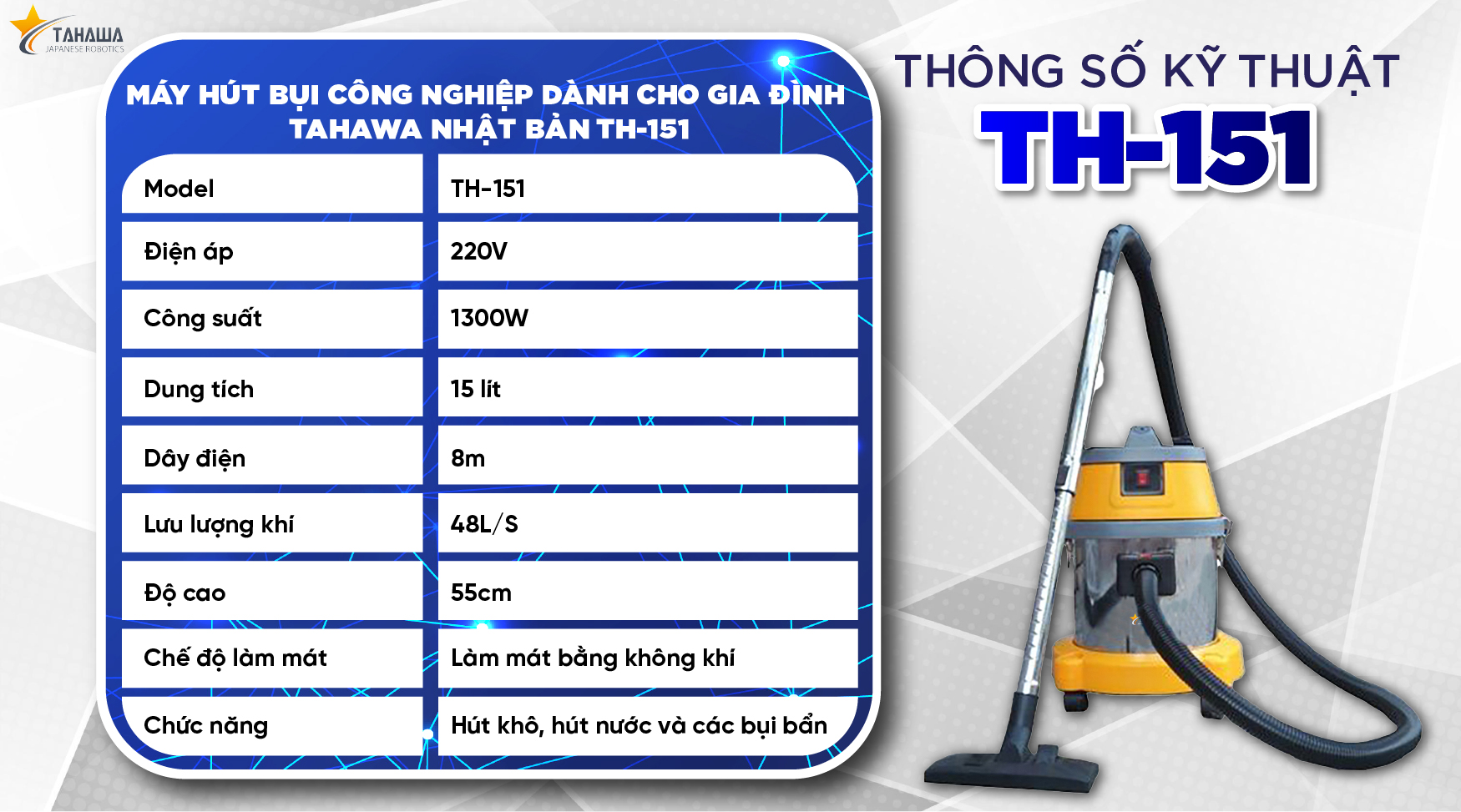Với trọng lượng chỉ 8kg, dung tích thùng chứa 15 lít và giá thành chưa đến 7 triệu đồng,  Máy hút bụi Tahawa TH-151 được đánh giá là chiếc máy hút bụi công nghiệp phù hợp với nhu cầu vệ sinh của nhiều gia đình hiện nay. Cụ thể là máy có thiết kế gọn nhẹ, hệ thống bánh xe di chuyển linh hoạt và dây điện dài 7 mét, có thể thực hiện vệ sinh cho những khu vực có diện tích hẹp với nhiều đồ đạc như phòng khách, phòng ngủ hay phòng bếp,… Đồng thời, thân máy cũng được làm từ chất liệu inox 304 chống gỉ sét, chịu được tác động từ môi trường làm việc bên ngoài nên có tuổi thọ dài lâu.