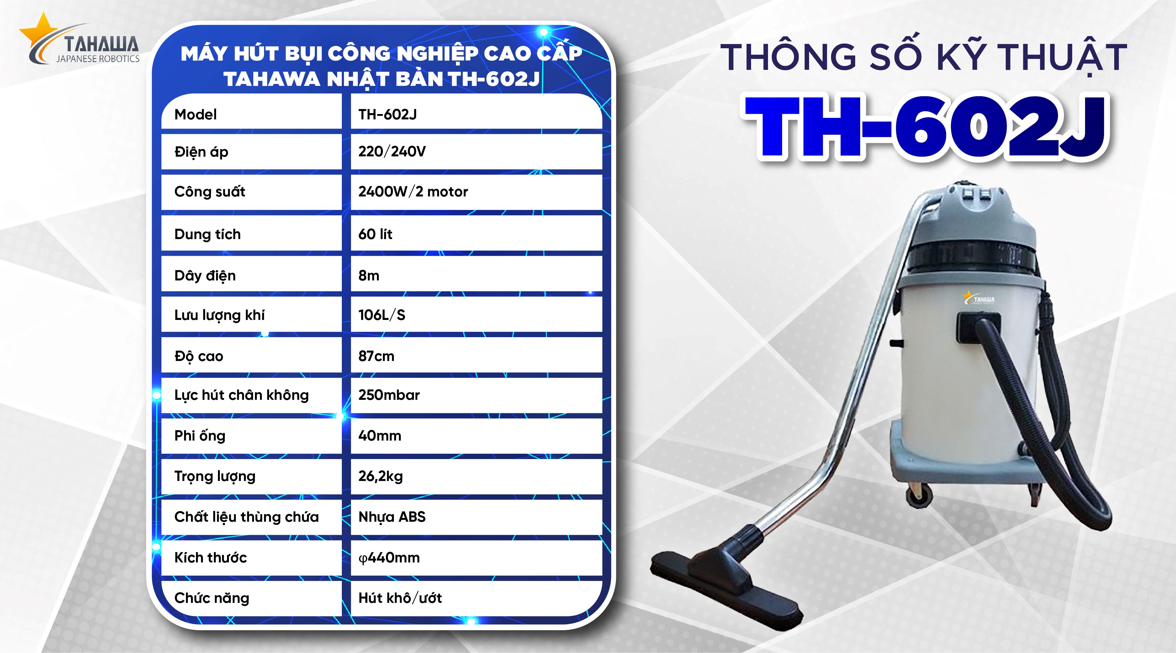 Máy hút bụi công nghiệp Tahawa TH-602J là một sản phẩm được sản xuất trên dây chuyền công nghệ Nhật hiện đại. Với công suất lớn, hút bụi mạnh mẽ, thùng chứa cực khủng. Máy phun hút giặt thảm là sản phẩm mới, chuyên gia vệ sinh cho các nhà hàng, khách sạn, tiệm giặt là, bệnh viện.