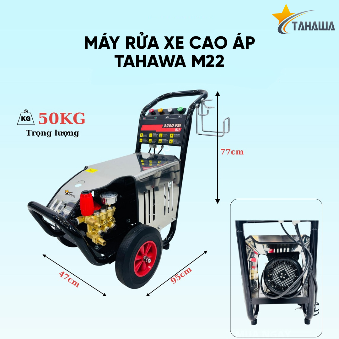 - Máy phun áp lực TAHAWA M22 được trang bị động cơ cảm ứng từ mạnh mẽ với công suất lên đến 2200W, cho khả năng tạo ra áp lực nước tối đa 150 bar. Với sức mạnh này, máy dễ dàng làm sạch các bề mặt có vết bẩn cứng đầu như bụi bẩn, bùn đất, dầu mỡ lâu ngày trên xe cộ, sân vườn hoặc thiết bị công nghiệp.