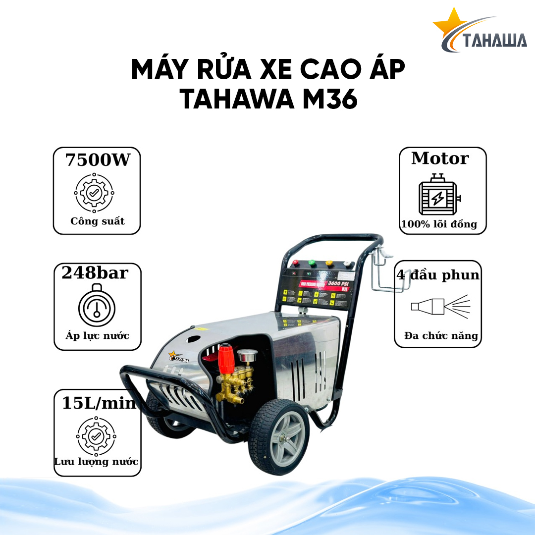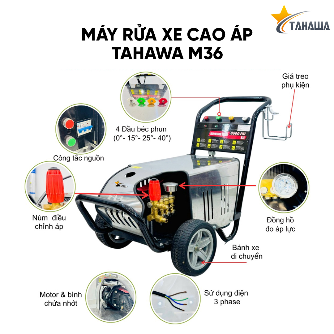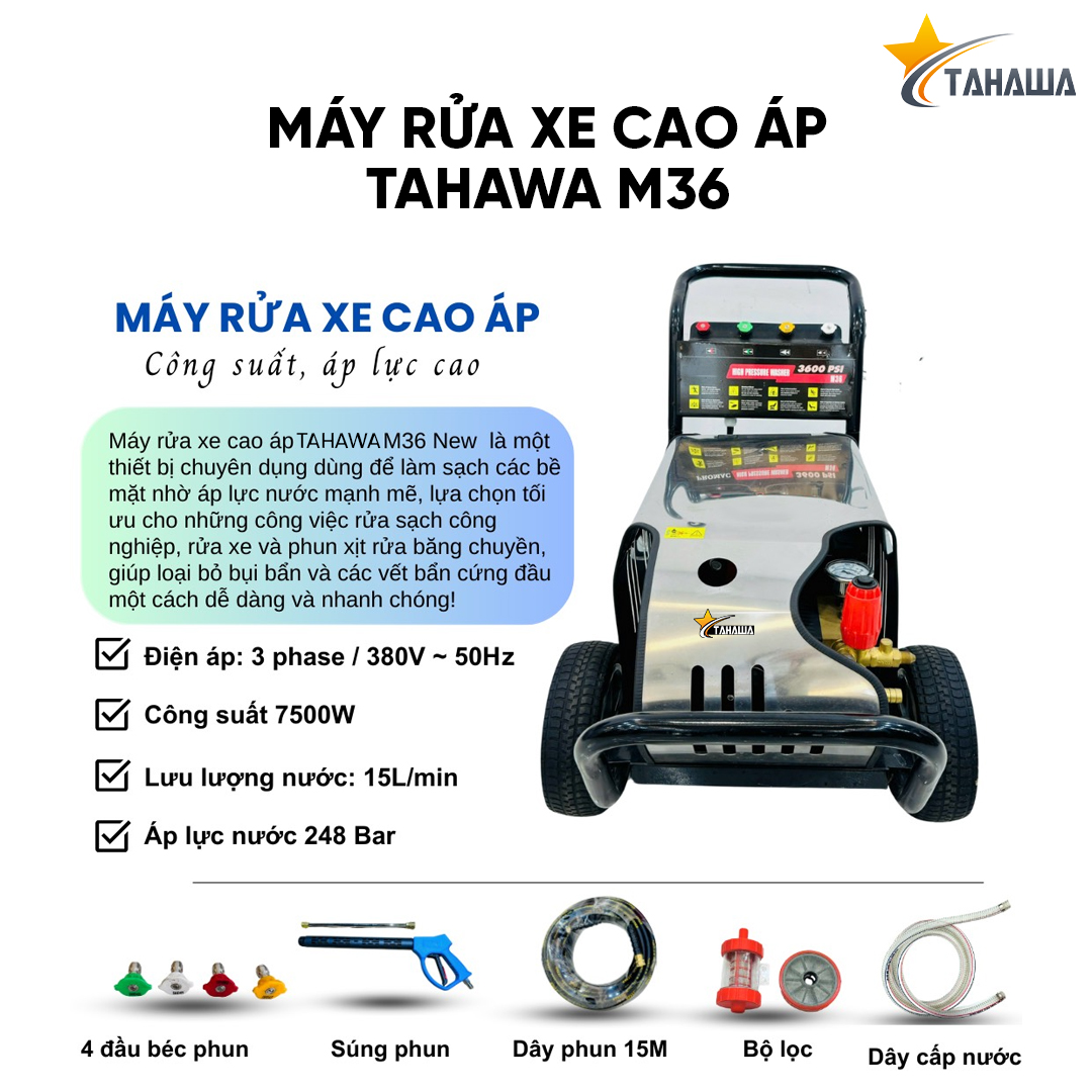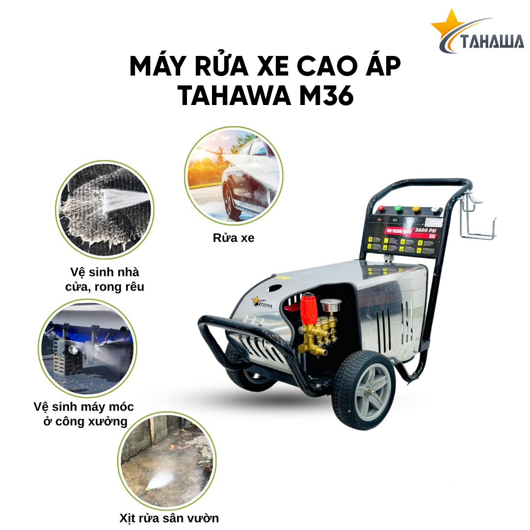 Máy phun áp lực TAHAWA M36 là thiết bị chuyên dụng được thiết kế đặc biệt cho các nhu cầu làm sạch chuyên nghiệp và công nghiệp. Với công suất mạnh mẽ và động cơ ba pha, máy phun áp lực M36 không chỉ đáp ứng tốt các yêu cầu vệ sinh cơ bản mà còn hoạt động hiệu quả trong môi trường công nghiệp có nhu cầu làm sạch liên tục. Đây là một sản phẩm lý tưởng để phun xịt rửa băng chuyền, vệ sinh bụi bẩn công nghiệp và hỗ trợ rửa xe quy mô lớn.