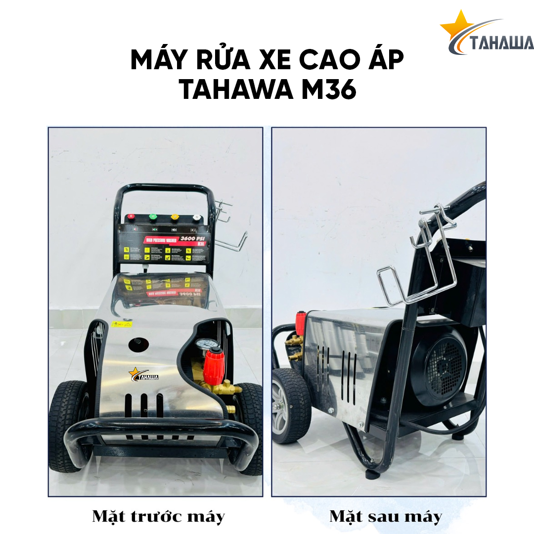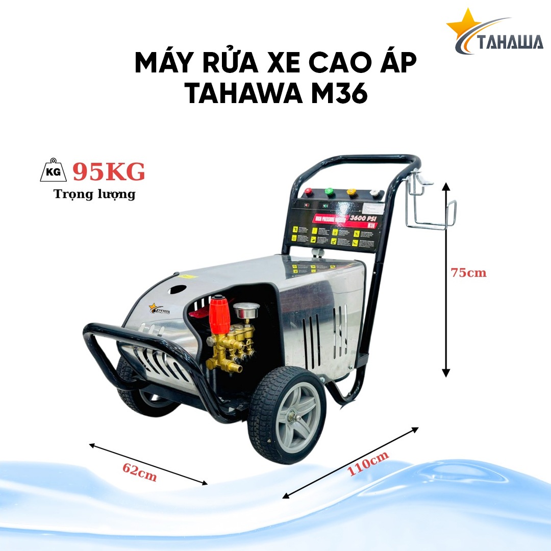 Với kích thước 84x46x54cm chưa lắp phụ kiện và 110x75x62 khi lắp đủ đủ phụ kiện, trọng lượng 95kg, máy phun áp lực TAHAWA M36 được thiết kế với khung thép chắc chắn, bánh xe lớn giúp dễ dàng di chuyển trên mọi bề mặt, kể cả địa hình gồ ghề.