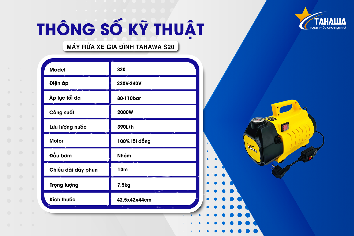 Máy rửa xe áp lực cao TAHAWA S20 được thiết kế với các thông số kỹ thuật tiên tiến, giúp tối ưu hóa hiệu suất làm việc: