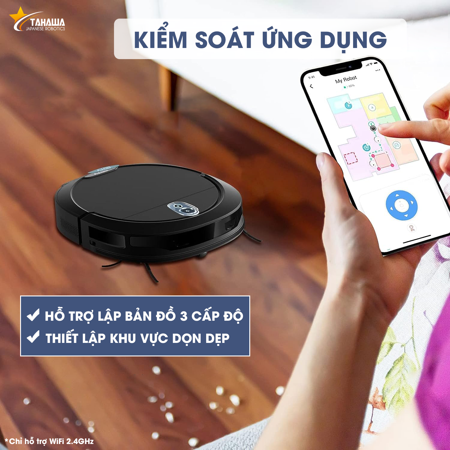 Robot Hút Bụi Lau Nhà Tự Giặt Giẻ Tahawa TH-M23 sử dụng app để thiết lập quy trình hoạt động. Thông qua ứng dụng này người dùng có thể bật/tắt, hẹn giờ cho robot làm việc. Ngoài ra còn có thể theo dõi robot hoạt động, điều chỉnh lực hút, lượng nước, thiết lập sơ đồ nhà, tường ảo, lên địa điểm hoặc chọn khu vực cho robot làm việc… mà không cần có mặt tại nhà.
