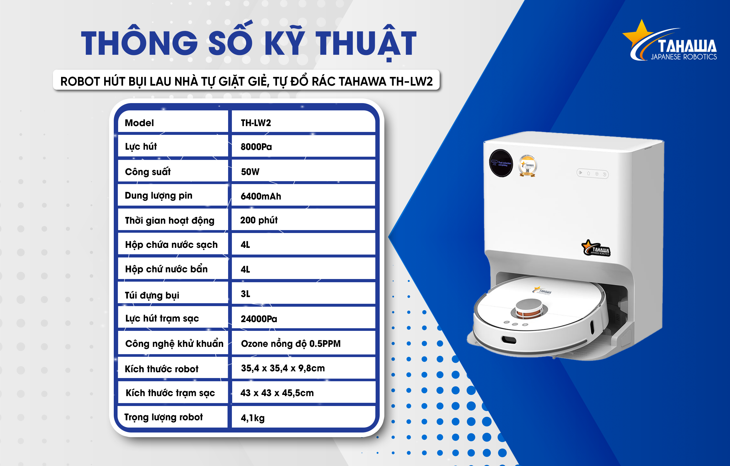 Robot Hút Bụi Lau Nhà Tự Giặt Giẻ, Tự Đổ Rác Tahawa TH-LW2 có thiết kế vô cùng gọn nhẹ với gam màu trắng sang trọng. phù hợp với mọi không gian sống.