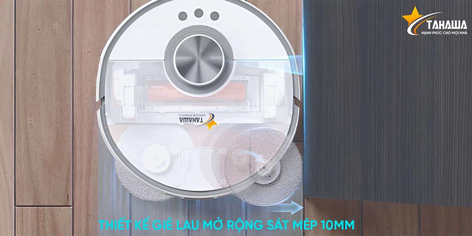 Robot Tahawa TH-LW2 phiên bản nâng cấp 2026 được trang bị cơ chế xòe rẻ tự động tại các góc và mép tường, đảm bảo làm sạch toàn diện ngay cả ở những khu vực khó tiếp cận — nơi các robot hút bụi thông thường thường bỏ sót.