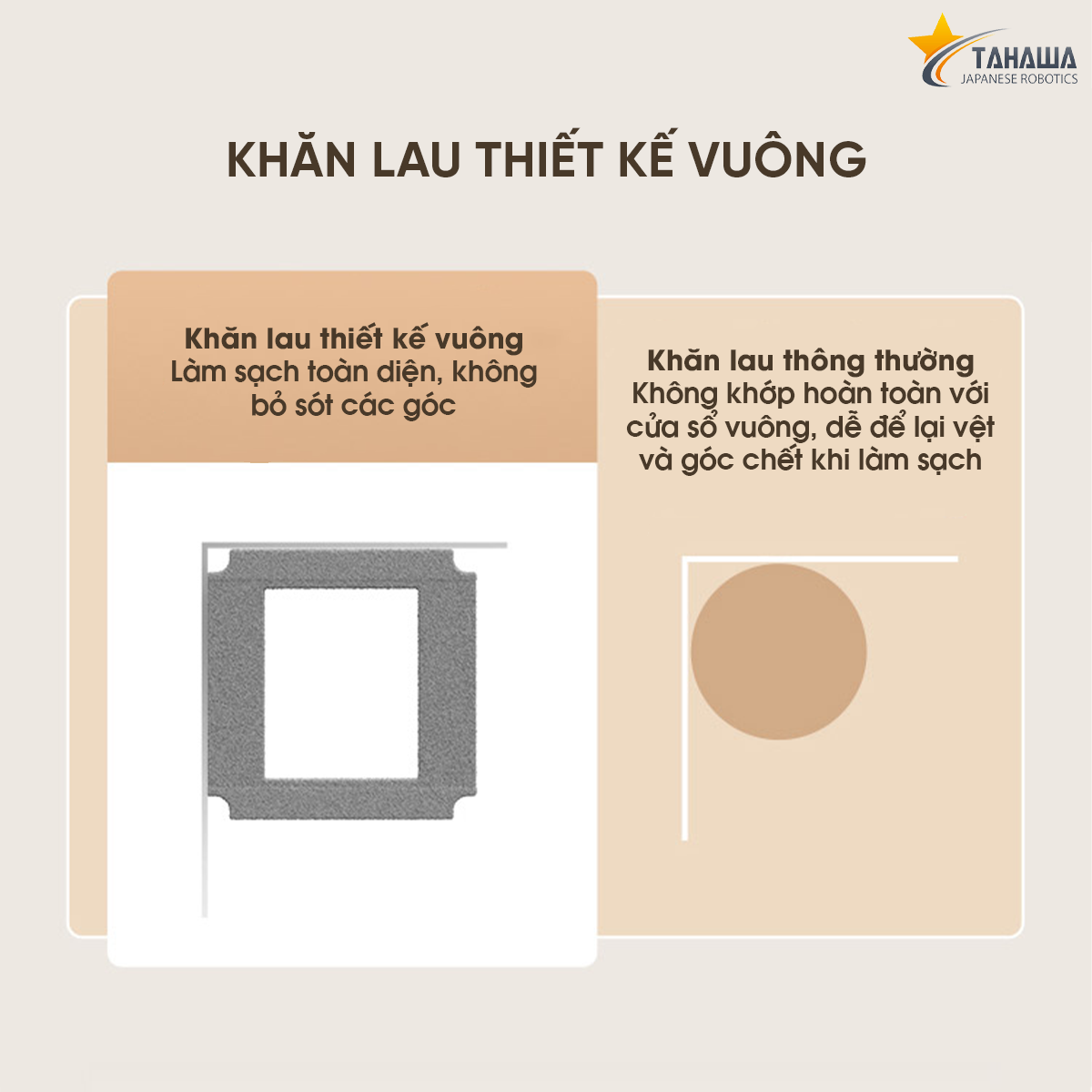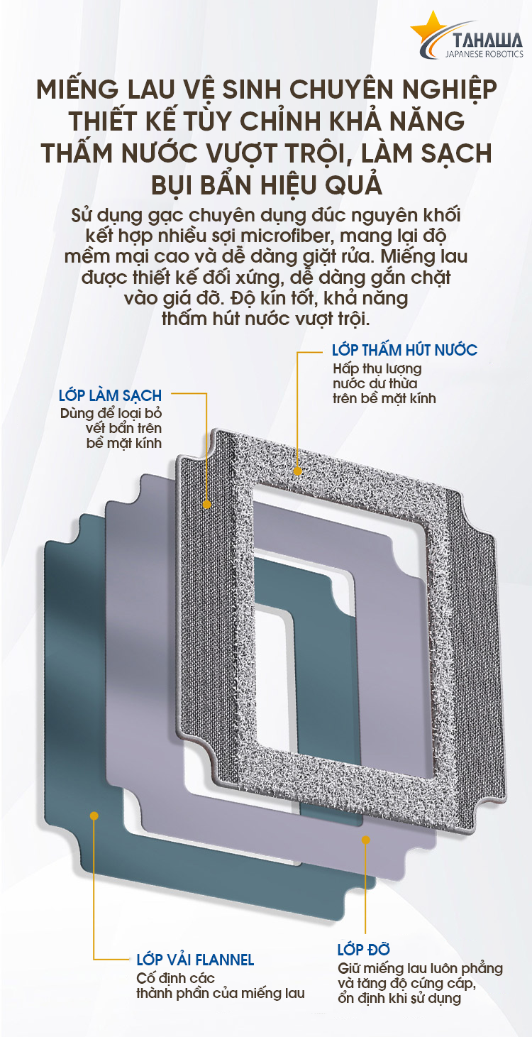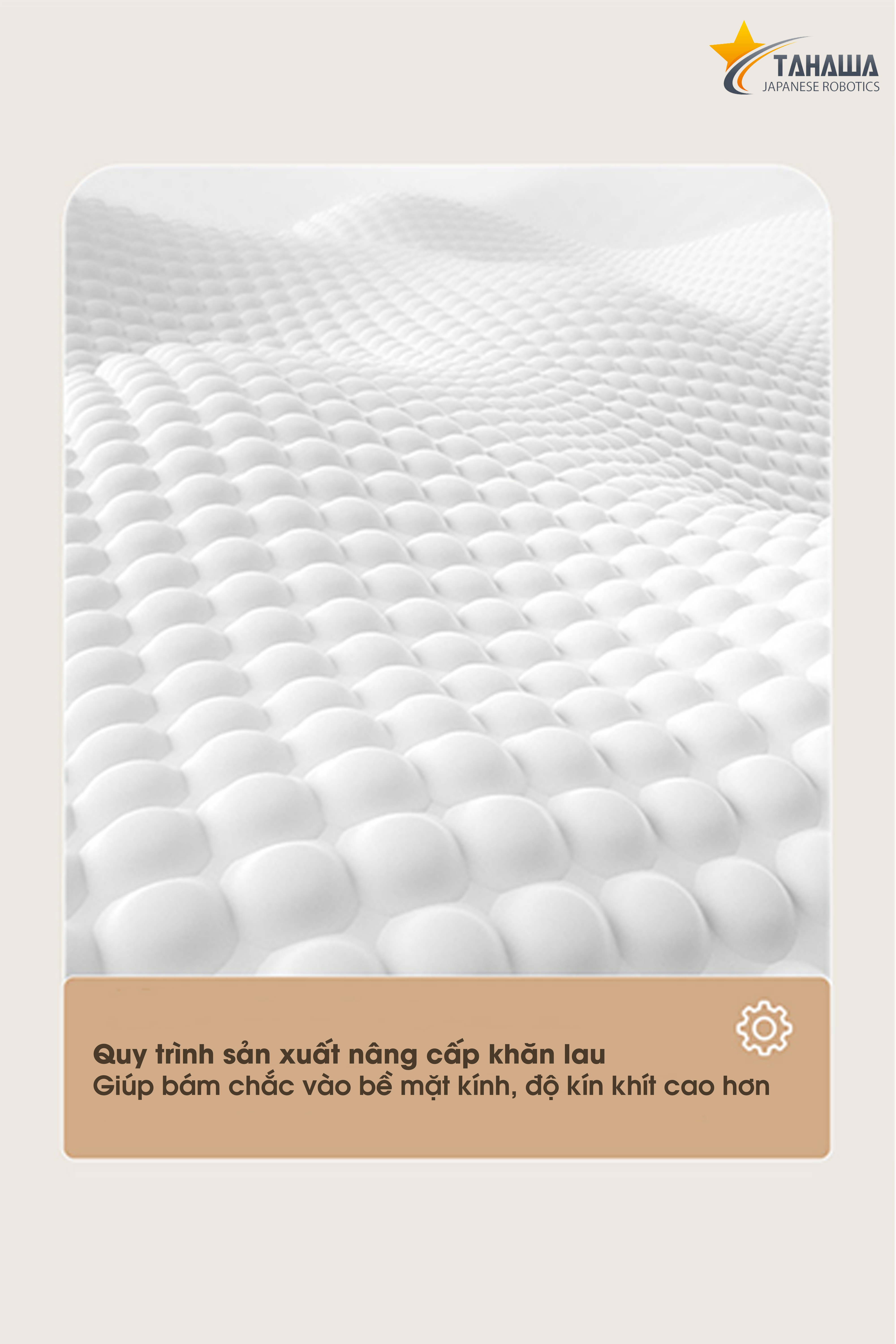 Tahawa TH-YW530 được trang bị bộ khăn lau đặc biệt liền mảnh làm từ sợi Microfiber cao cấp dày 3mm, có khả năng hút bụi và thấm nước vượt trội. Loại sợi này có cấu trúc mịn gấp 100 lần so với tóc người, cho phép robot loại bỏ cả bụi mịn PM2.5, dầu mỡ và vết ố lâu ngày trên kính mà không gây trầy xước.