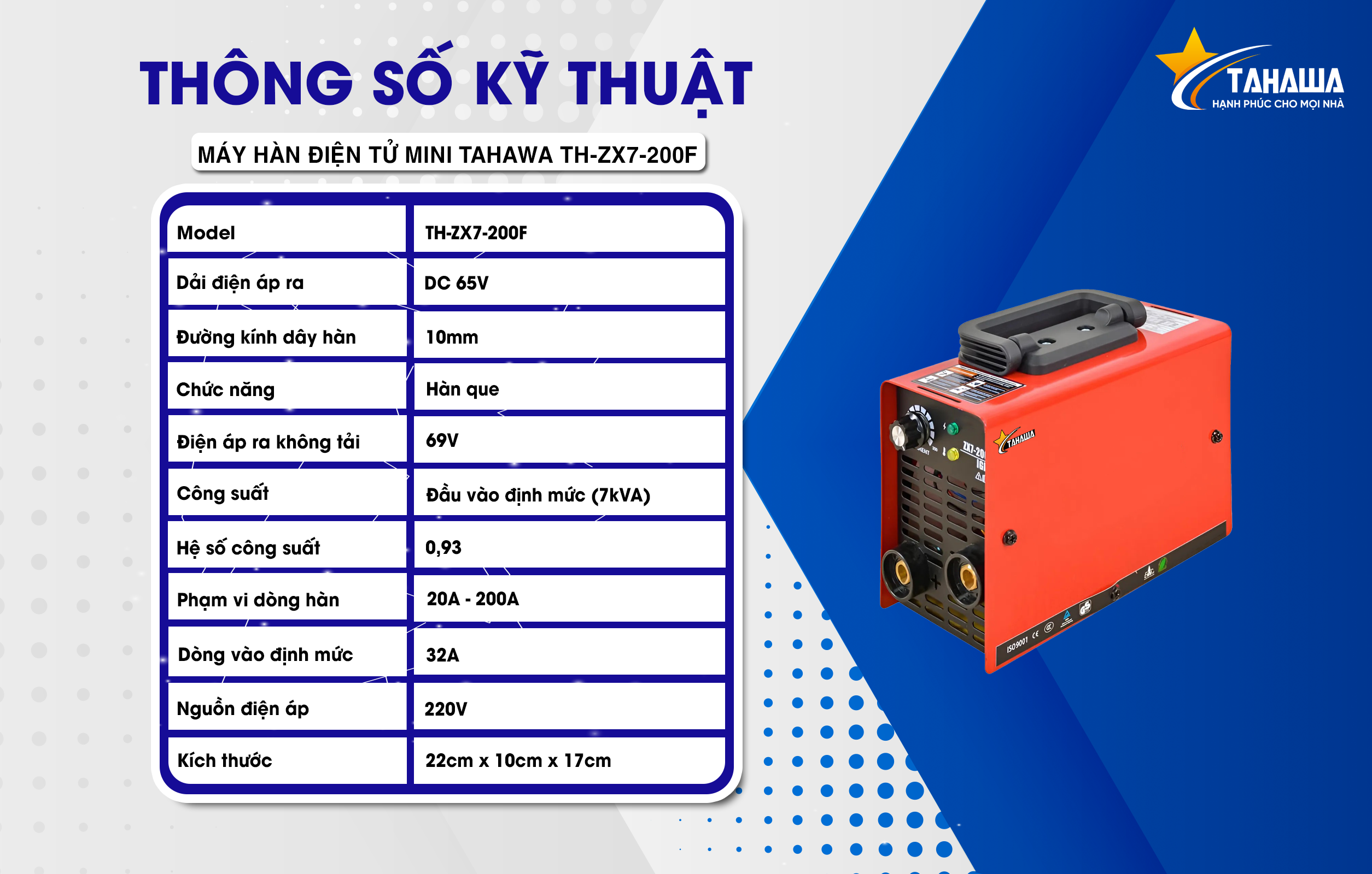 Máy hàn điện tử Tahawa TH-ZX7-200F hoạt động với công suất đầu vào định mức 7kVA, dải điện áp ra DC 65V, điện áp không tải 69V. Máy có khả năng điều chỉnh dòng hàn linh hoạt từ 20A - 200A, đáp ứng nhu cầu hàn trên nhiều loại vật liệu khác nhau.