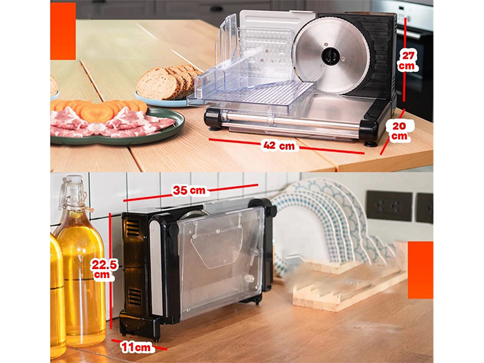 Máy có công suất 160W, kết hợp với lưỡi dao sắc bén, đảm bảo thái trơn tru các loại thực phẩm như thịt bò, gà, lợn, bánh mì, xúc xích và nhiều nguyên liệu khác mà không bị nát hay rách. Đặc biệt, người dùng có thể điều chỉnh độ dày lát cắt từ 0 đến 14mm, đáp ứng nhu cầu chế biến đa dạng món ăn như lẩu, nướng hay nhúng.