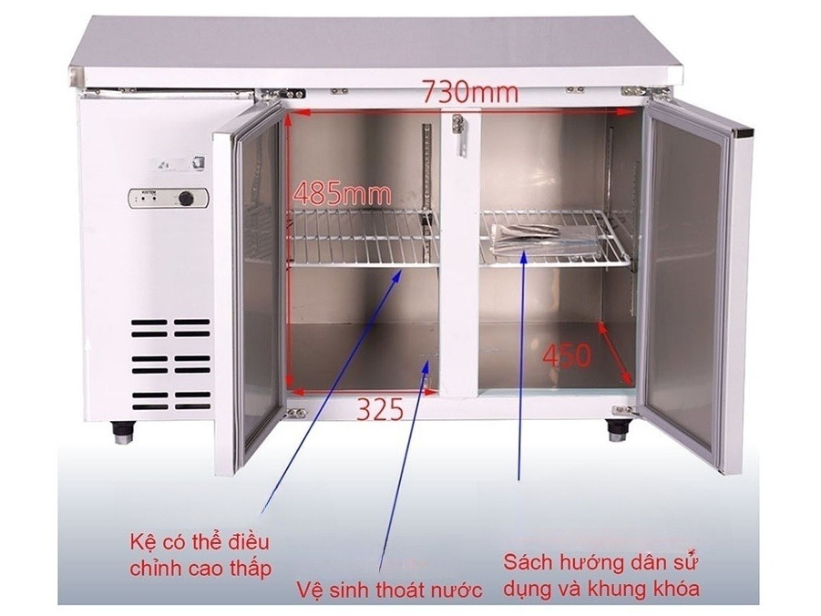 Khung kệ bên trong cũng có thể điều chỉnh độ cao hoặc thấp để phù hợp với kích thước và loại thực phẩm cần bảo quản, mang đến sự tiện lợi tối đa trong quá trình sử dụng.