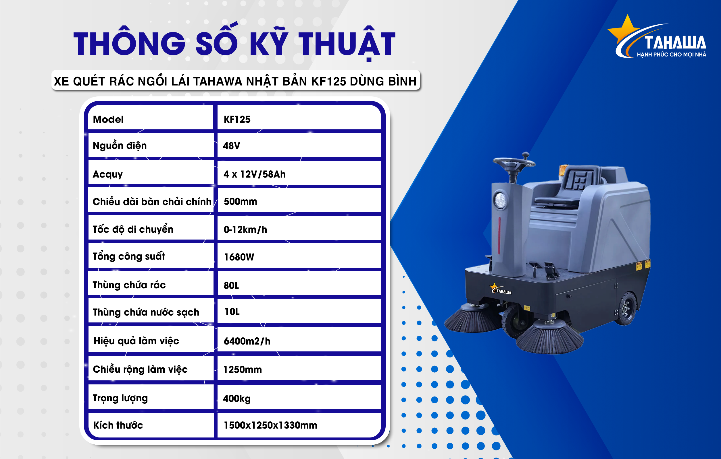 1. Thông số kỹ thuật máy quét rác ngồi lái Tahawa Nhật Bản KF125