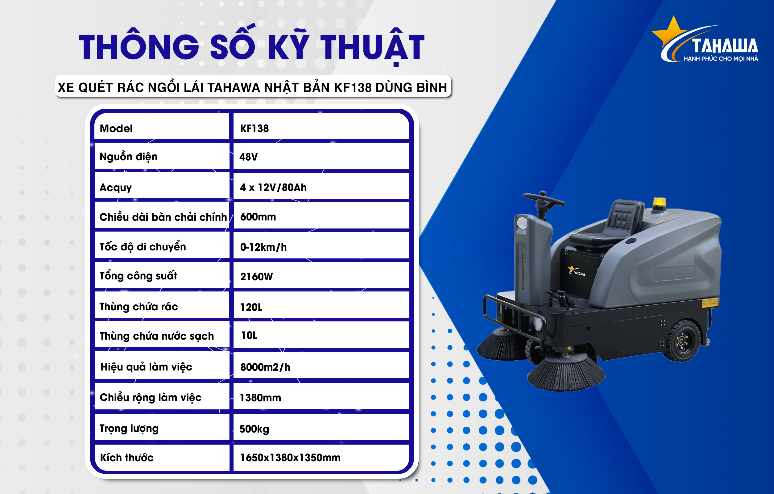 Tahawa KF138 là dòng máy quét rác công nghiệp dạng ngồi lái đến từ thương hiệu Tahawa Nhật Bản, sử dụng nguồn điện 48V từ 4 bình ắc quy 12V/80Ah, cho phép máy hoạt động liên tục trên 4 giờ chỉ với một lần sạc. Thiết bị này có hiệu suất làm việc lên đến 8000m²/giờ, phù hợp cho các khu vực có diện tích lớn và yêu cầu cao về vệ sinh môi trường.