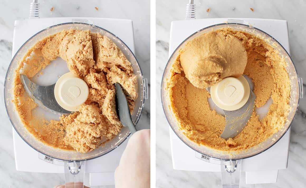 Bóc vỏ lạc, cho hạt đã rang vào máy xay sinh tố. Có thể thêm một chút nước ấm hoặc dầu ăn để máy dễ hoạt động, nhưng điều này sẽ làm giảm độ nguyên chất của dầu thu được. Xay liên tục đến khi hỗn hợp trở thành dạng bột nhão.