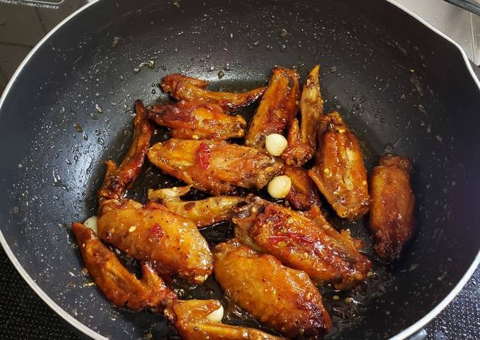 - Khi nước sốt đã sệt lại, cho cánh gà đã chiên vào chảo, đảo đều để cánh gà thấm đều nước sốt. Đun thêm khoảng 2-3 phút trên lửa nhỏ để cánh gà ngấm kỹ gia vị.