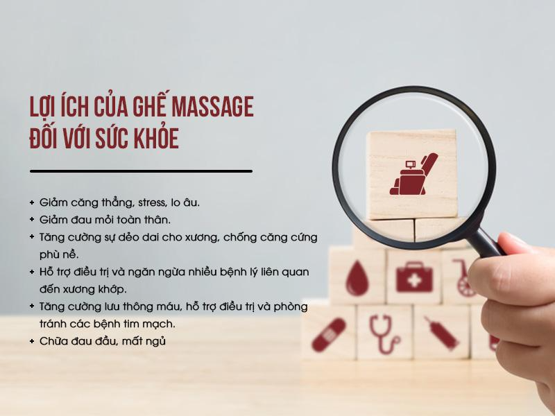 Ngoài việc, tăng cường lưu thông máu, đả thông kinh mạch ra, khi sử dụng ghế massage còn giúp người dùng tăng cường sức khỏe, do các bộ phận trên cơ thể được tác động đều đặn. Từ đó, giúp cho cơ thể chúng ta có vận động và sinh ra các chất đề kháng tăng cường sức khỏe