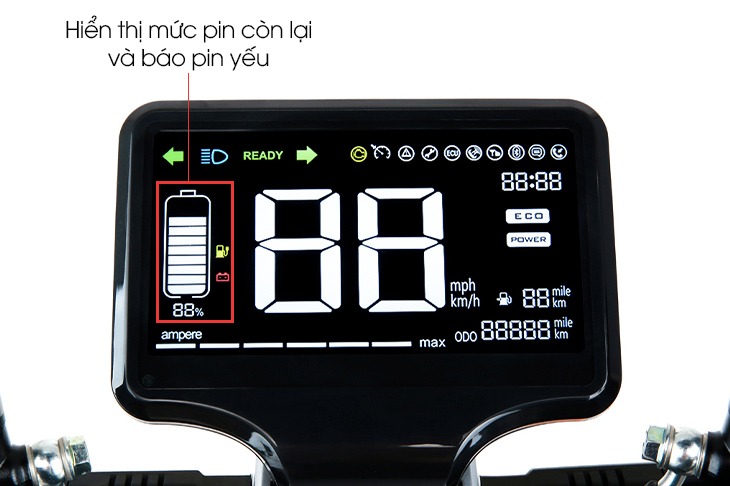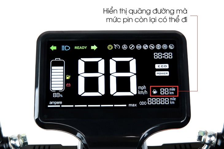 Ở mục này, xe hiện quãng đường (km) mà bạn có thể di chuyển được với lượng pin còn lại. Do vậy, bạn nên để ý thường xuyên mục này và xác định quãng đường dự định đi trước khi di chuyển xe, nếu số km thông báo trên xe ngắn hơn đoạn đường bạn muốn đi thì hãy nạp pin ngay vào để tránh tình trạng dắt bộ giữa đường.
