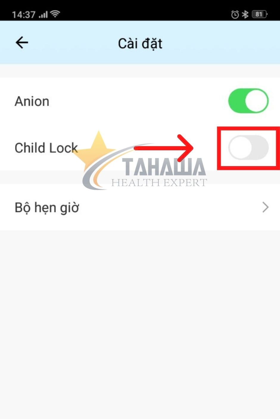 Bật/tắt khóa trẻ em trên App điều khiển máy lọc không khí Tahawa Nhật Bản TH-AP21