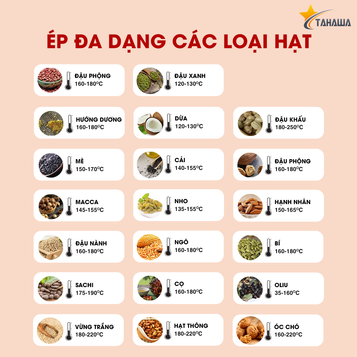 ✅ Kết luận: Việc cài đặt nhiệt độ đúng cách khi sử dụng máy ép dầu mini gia đình Tahawa không chỉ giúp tăng năng suất, tiết kiệm nguyên liệu mà còn giữ trọn hương vị cũng như giá trị dinh dưỡng trong từng giọt dầu. Với sự linh hoạt giữa ép nóng và ép lạnh, Tahawa mang đến giải pháp ép dầu tối ưu ngay tại căn bếp của bạn.