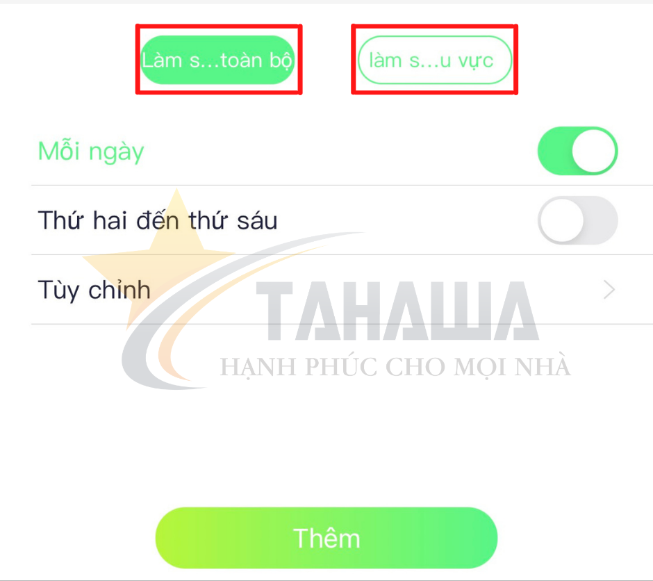 Cuối cùng, ở chế độ hẹn giờ làm sạch có ba chế độ chọn thứ làm việc: mỗi ngày, thứ hai đến thứ sáu hoặc tùy chỉnh thứ ngày làm việc theo ý thích và nhu cầu của gia đình. Sau đó, bấm Thêm và hoàn tất việc đặt lịch hẹn, như vậy chỉ cần đến đúng thời gian đó, robot sẽ tự động làm việc.