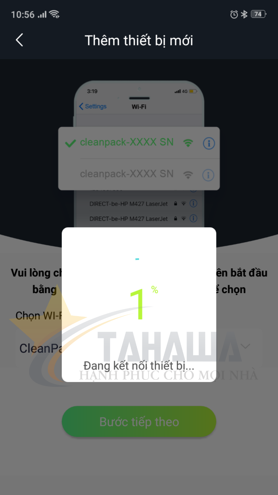 Bước 4: Chuyển sang chế độ Wifi, tìm Wifi có tên “CleanPack-.....” và bấm vào kết nối chờ khoảng vài giây để kết nối xong
