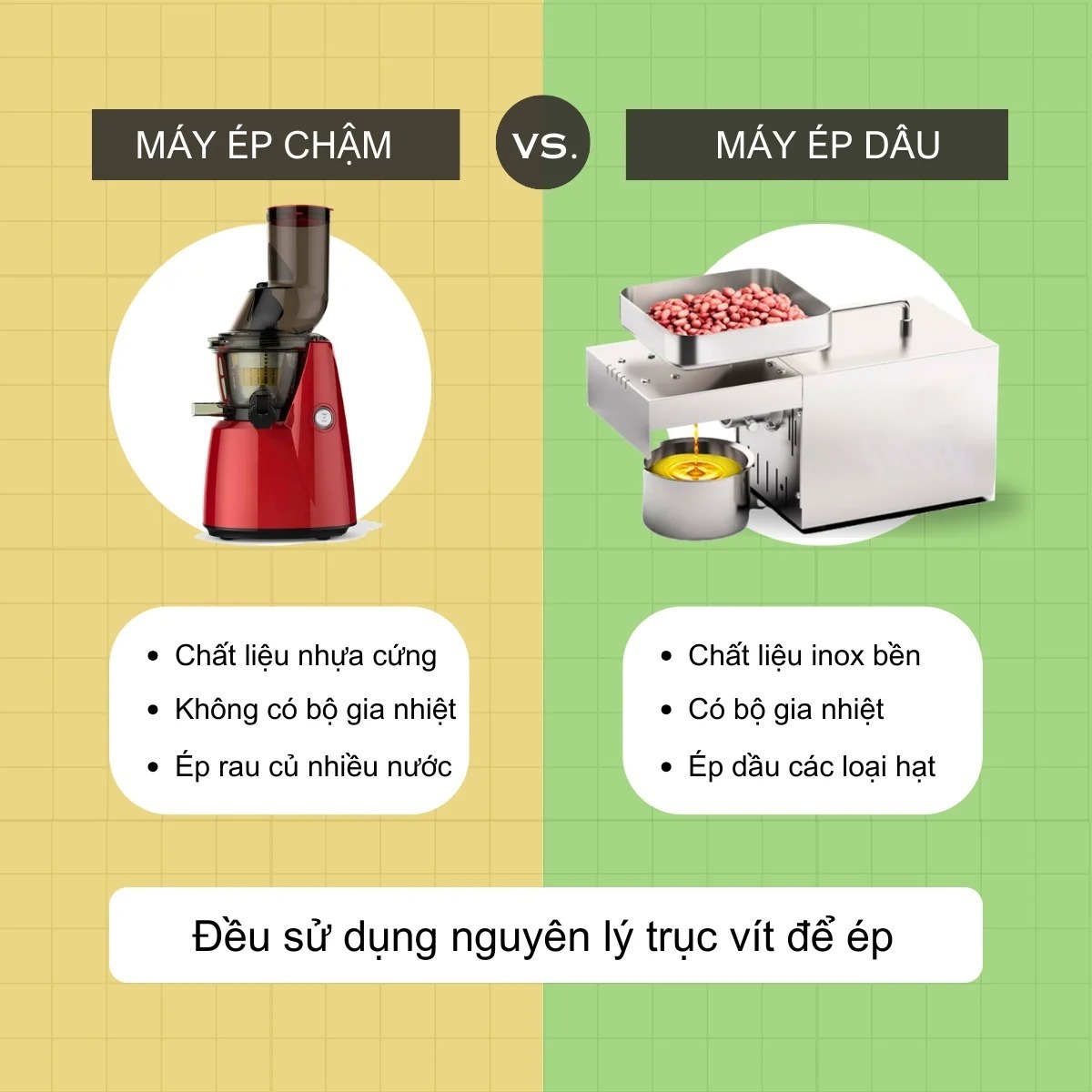 Máy ép chậm và máy ép dầu đều hoạt động theo nguyên lý ép của trục xoắn đưa nguyên liệu từ đầu trục đến cuối trục để tách tinh chất bên trong ra. Tuy nhiên cấu tạo của máy ép chậm lại khác so với máy ép dầu. Máy ép chậm có trục ép bằng nhựa, dễ gãy, chỉ phù hợp để ép với các rau quả mọng nước có độ mềm và không quá cứng. Còn máy ép dầu gia đình có trục ép bằng inox, có bộ gia nhiệt trục để làm nóng, chỉ có thể ép hạt cứng, không ép được các hạt mọng nước.