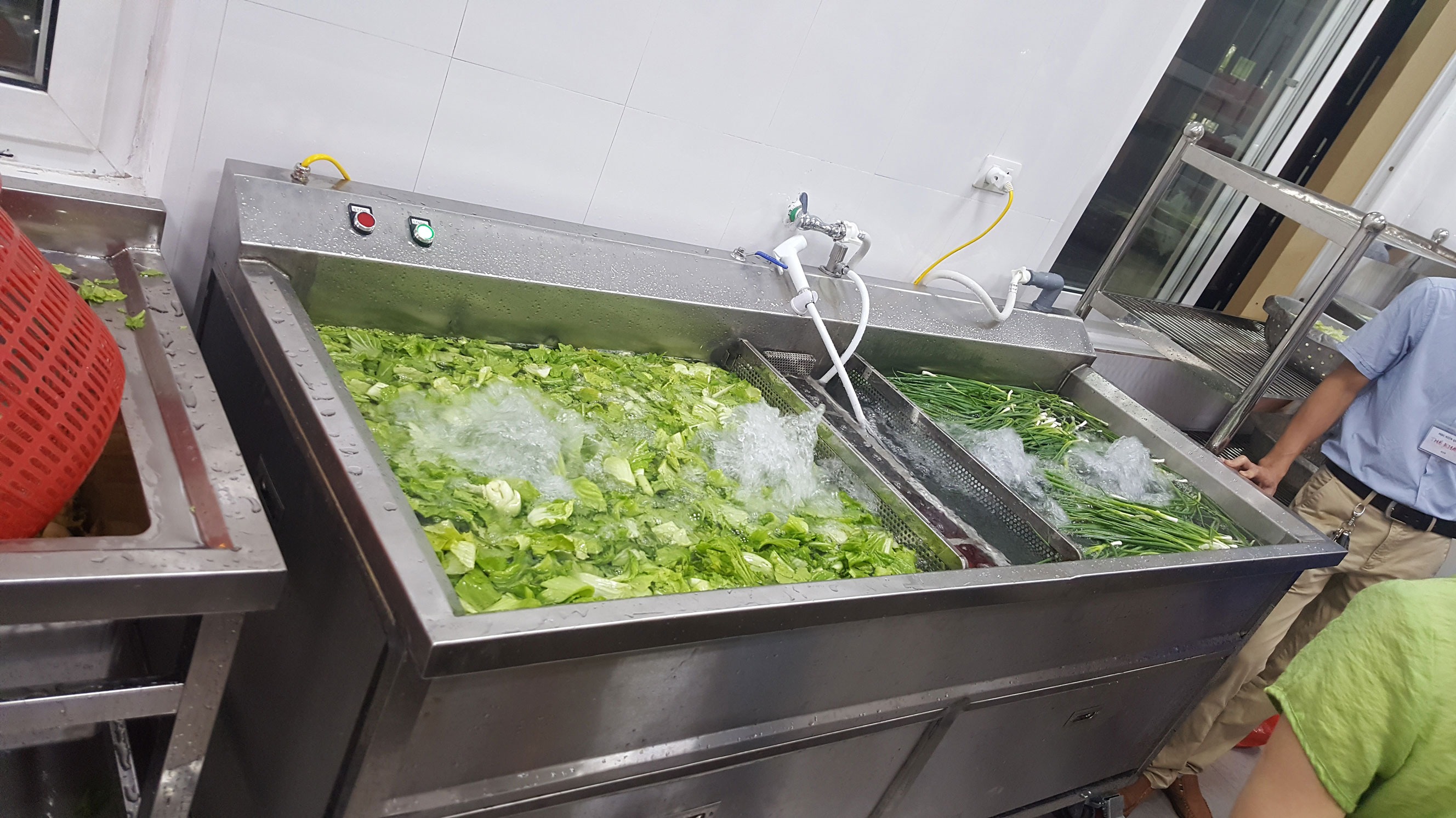 Máy rửa rau giúp loại bỏ bụi bẩn và tạp chất ban đầu, trong khi máy khử khuẩn giúp xử lý sâu các yếu tố vi sinh và hóa học.