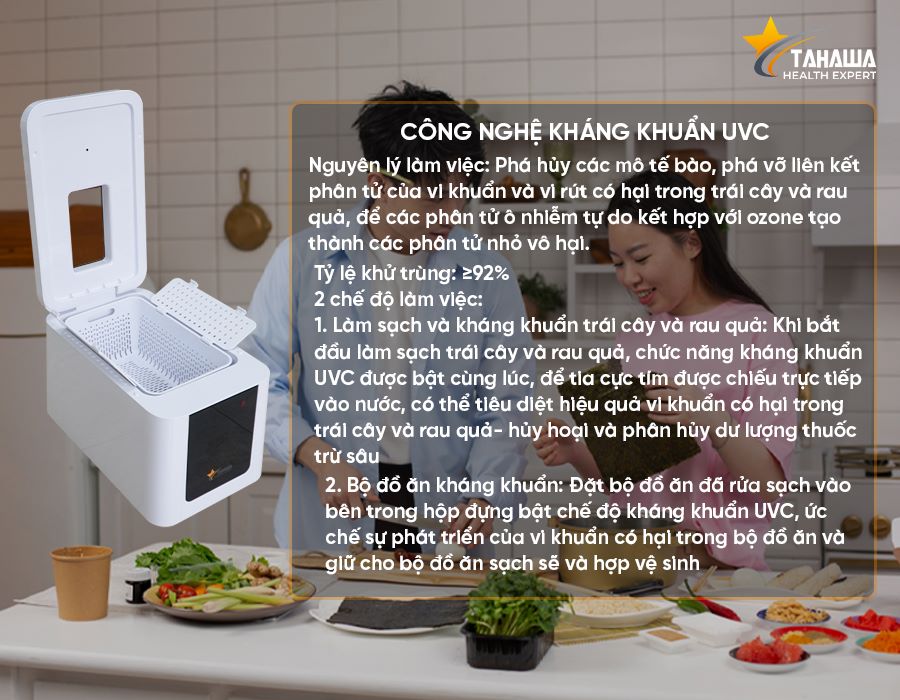 Tahawa đã nghiên cứu và cho ra đời máy rửa thực phẩm đa năng Tahawa COH15-C6B tích hợp 4 công nghệ làm sạch thực phẩm hàng đầu thế giới hiện nay: Công nghệ điện phân Hydroxyl,công nghệ khử trùng bằng UVC, công nghệ Ultrasonic tạo sóng siêu âm cao tần và công nghệ tuần hoàn nước giúp làm sạch, khử trùng khử độc thực phẩm lên đến 99,99%.