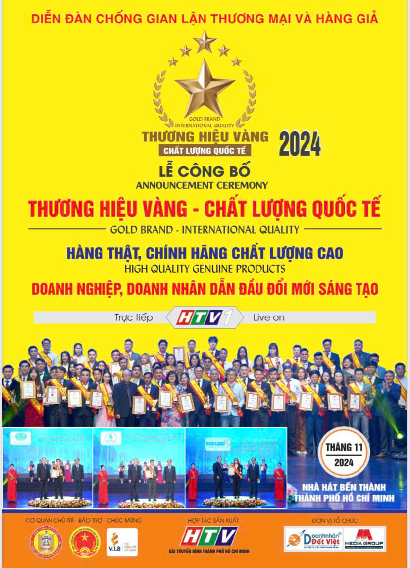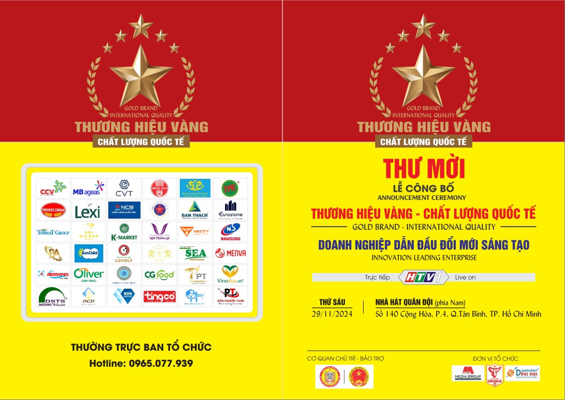 Vào ngày 29/11/2024, sự kiện uy tín “Thương Hiệu Vàng - Chất Lượng Quốc Tế” sẽ chính thức diễn ra tại Nhà Hát Quân Đội Phía Nam. Đây là một trong những sự kiện thường niên có quy mô lớn, nhằm vinh danh các doanh nghiệp và thương hiệu hàng đầu tại Việt Nam cùng nhiều đối tác quốc tế uy tín. Chương trình được tổ chức bởi Media Group, phối hợp với Trung tâm Chống Hàng Giả và Báo Doanh Nhân Đất Việt, dưới sự bảo trợ và chủ trì của Viện Chống Gian Lận Thương Mại và Hàng Giả cùng Hội Chống Hàng Giả và Bảo Vệ Thương Hiệu.