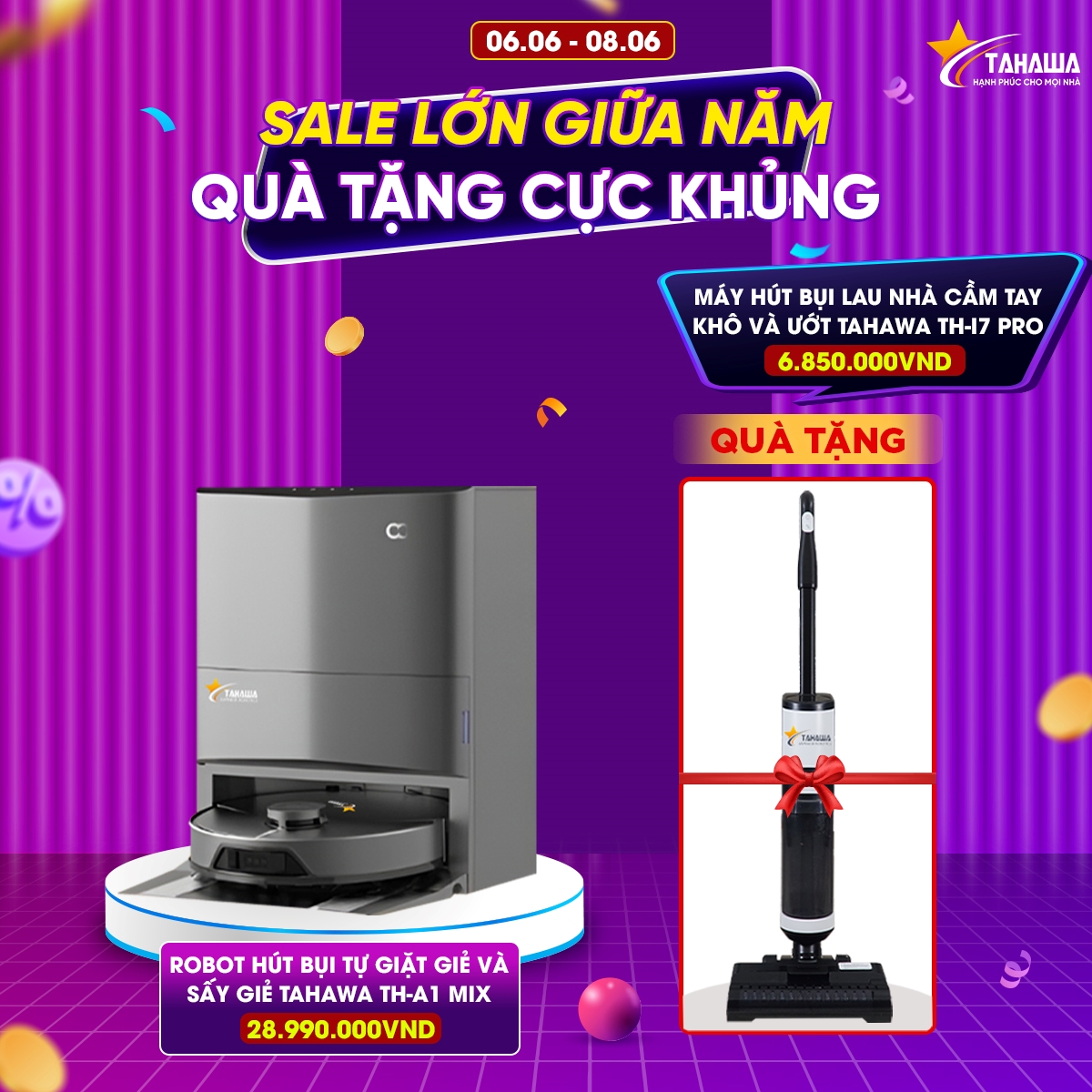 Chào mừng đến với chương trình khuyến mãi đặc biệt ngày 6-6 của chúng tôi! Đây là cơ hội vàng để bạn nâng cấp không gian sống của mình với sản phẩm công nghệ tiên tiến nhất. Đừng bỏ lỡ cơ hội sở hữu em Robot hút bụi lau nhà tự giặt giẻ Tahawa TH-A1 Mix với giá ưu đãi 28.990.000đ. Đặc biệt, khi mua sản phẩm này trong thời gian khuyến mãi, bạn sẽ được TẶNG MIỄN PHÍ Máy hút bụi lau nhà cầm tay Tahawa TH-I7 Pro trị giá lên đến 6.850.000đ.