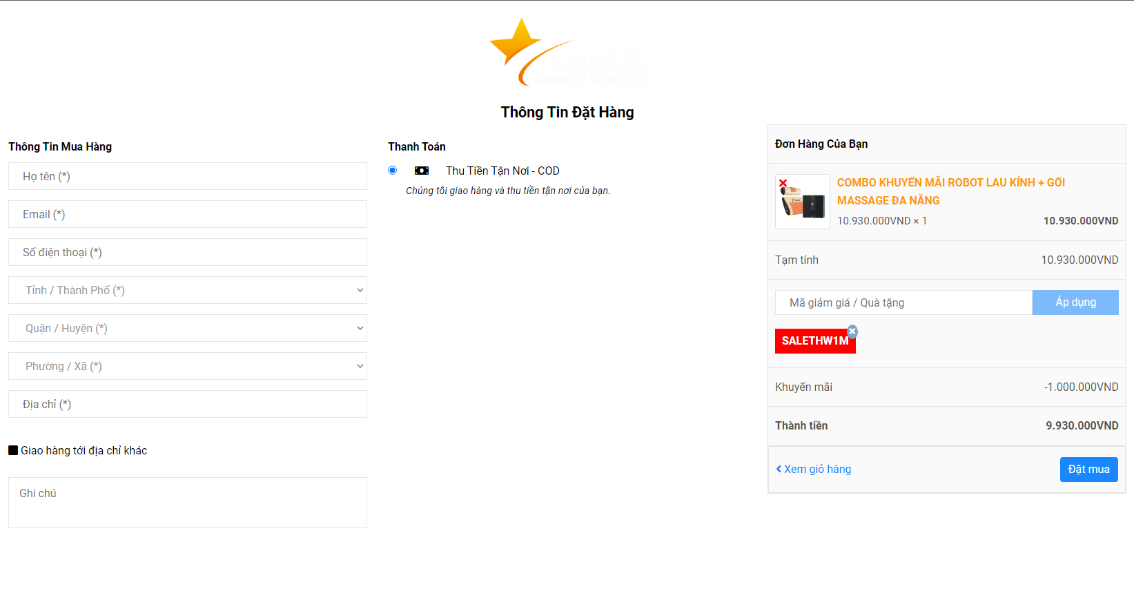 Bước 3: Nhập mã giảm giá SALETHW1M vào cột bên phải của giỏ hàng và áp dụng mã. Sau đó tiến hành đặt hàng