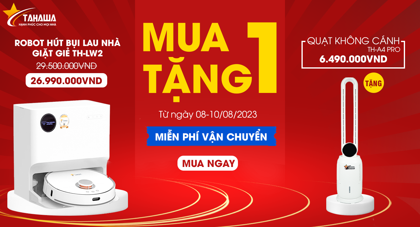 Mua hàng không cần trả trước – lãi suất 0%, tặng thêm bộ phụ kiện hấp dẫn. Đặc biệt nhất, Mua 1 Robot hút bụi lau nhà tự giặt giẻ, tự đổ rác Tahawa TH-LW2 bạn sẽ được tặng 1 Quạt không cánh Tahawa TH-A4 Pro.